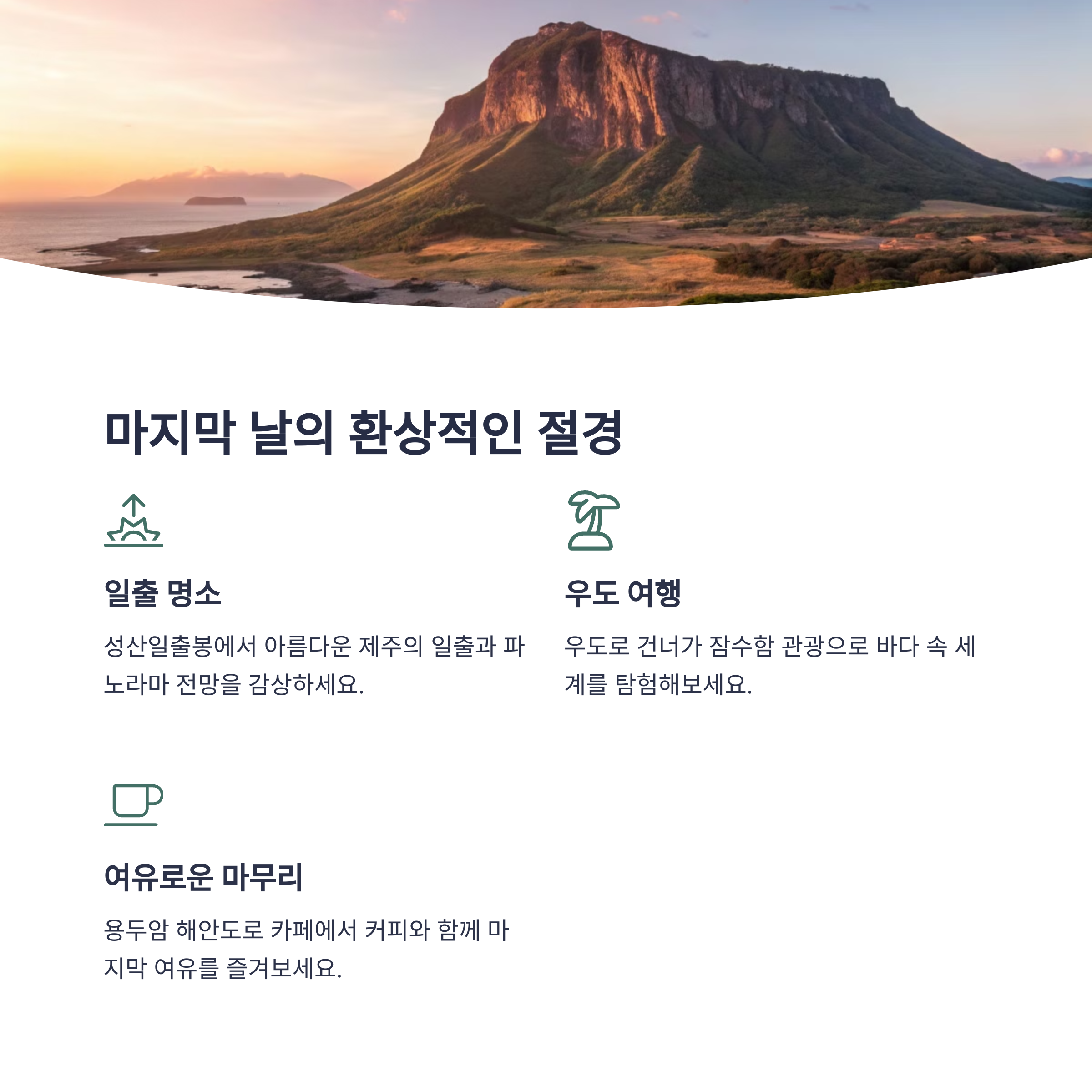 셋째 날에는 제주도의 동부 지역을 탐방합니다. 휴애리생활공원과 쇠소깍에서 자연을 즐기고, 제주민속촌에서 제주 전통 문화를 경험할 수 있습니다. 미천굴 일출랜드에서는 일출을 보며 제주 자연의 아름다움을 감상하고, 산굼부리 분화구를 둘러보며 제주 화산의 매력을 느낄 수 있습니다.