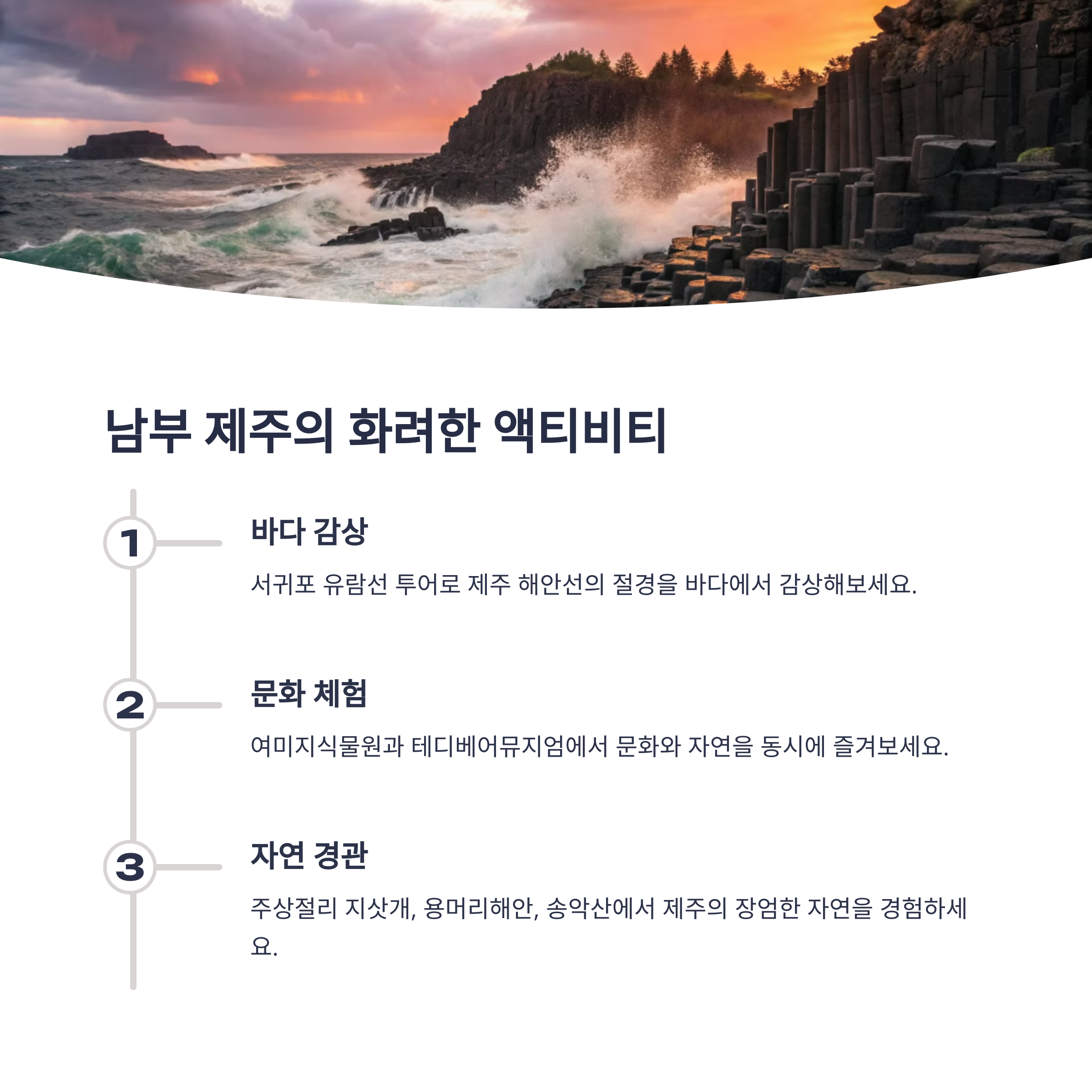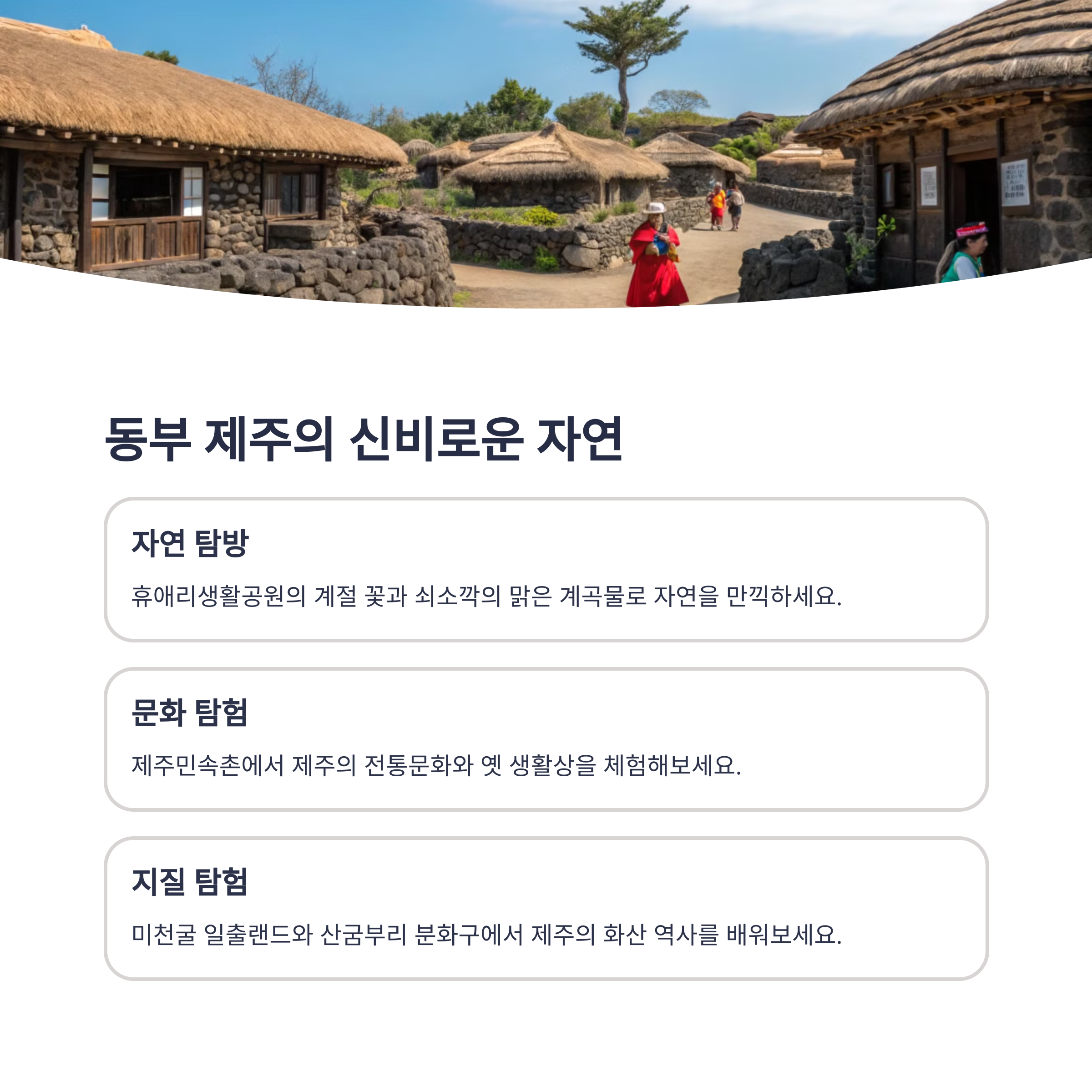 | 자연과 문화가 어우러진 제주 대표 관광지 | 열기구, 카트, 유람선 등 다양한 액티비티가 가득 | 제주도 화산 분화구를 관람할 수 있는 명소 |