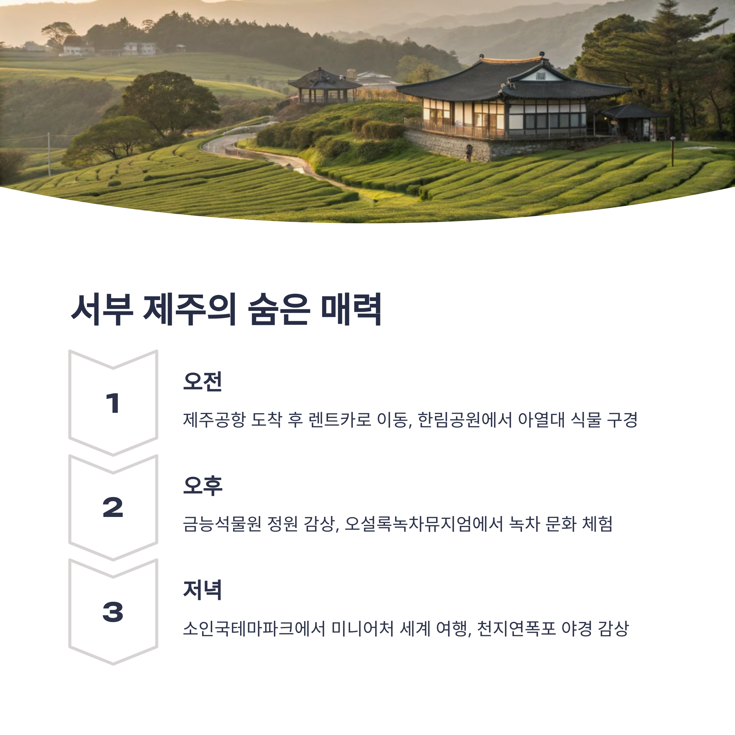 제주도 여행의 첫 번째 날은 제주공항에 도착 후 한림공원과 금능석물원을 방문하며 자연을 만끽할 수 있습니다. 오설록녹차뮤지엄에서는 제주도의 유명한 녹차 문화를 배우고, 소인국테마파크에서는 다양한 미니어처들을 구경할 수 있습니다. 마지막으로 천지연폭포에서 자연의 아름다움을 느끼며, 숙소로 돌아가 휴식을 취하는 일정입니다.
