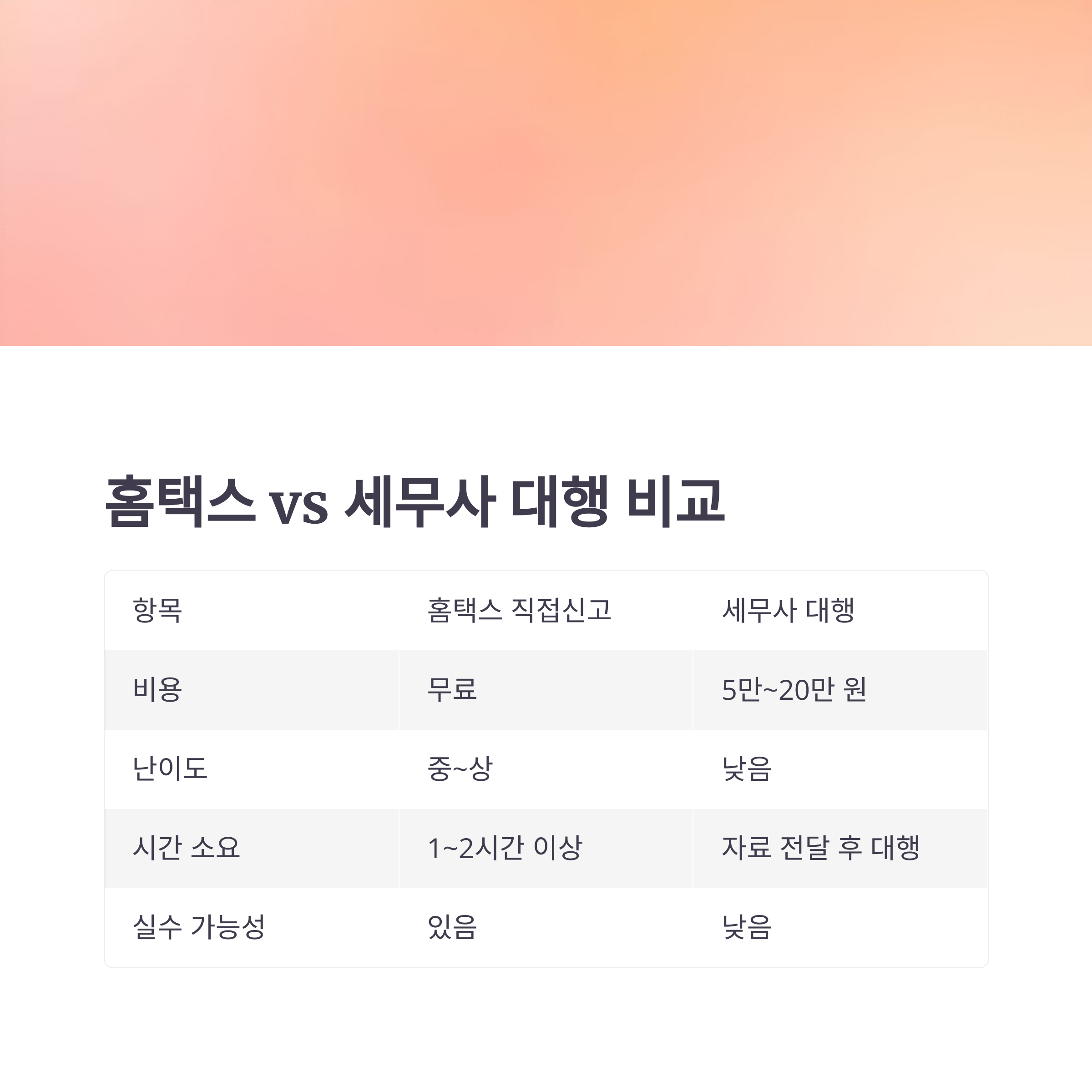 간단한 소득이라면 홈택스가 충분하지만, 복잡한 소득구조일 경우 세무사 대행이 더 안전할 수 있습니다.
