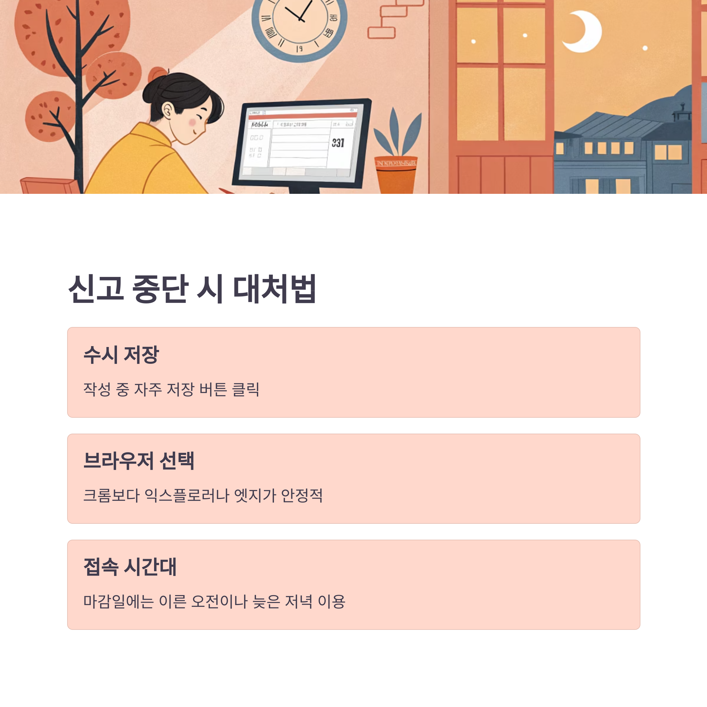 홈택스에서는 작성 도중 저장 기능을 제공하지만, 브라우저 종료나 세션 만료로 작성 내용이 삭제되는 경우도 적지 않습니다. 이를 방지하려면 수시로 저장을 누르고, 장시간 입력 시 크롬보다는 익스플로러나 엣지를 사용하는 것이 안정적입니다.