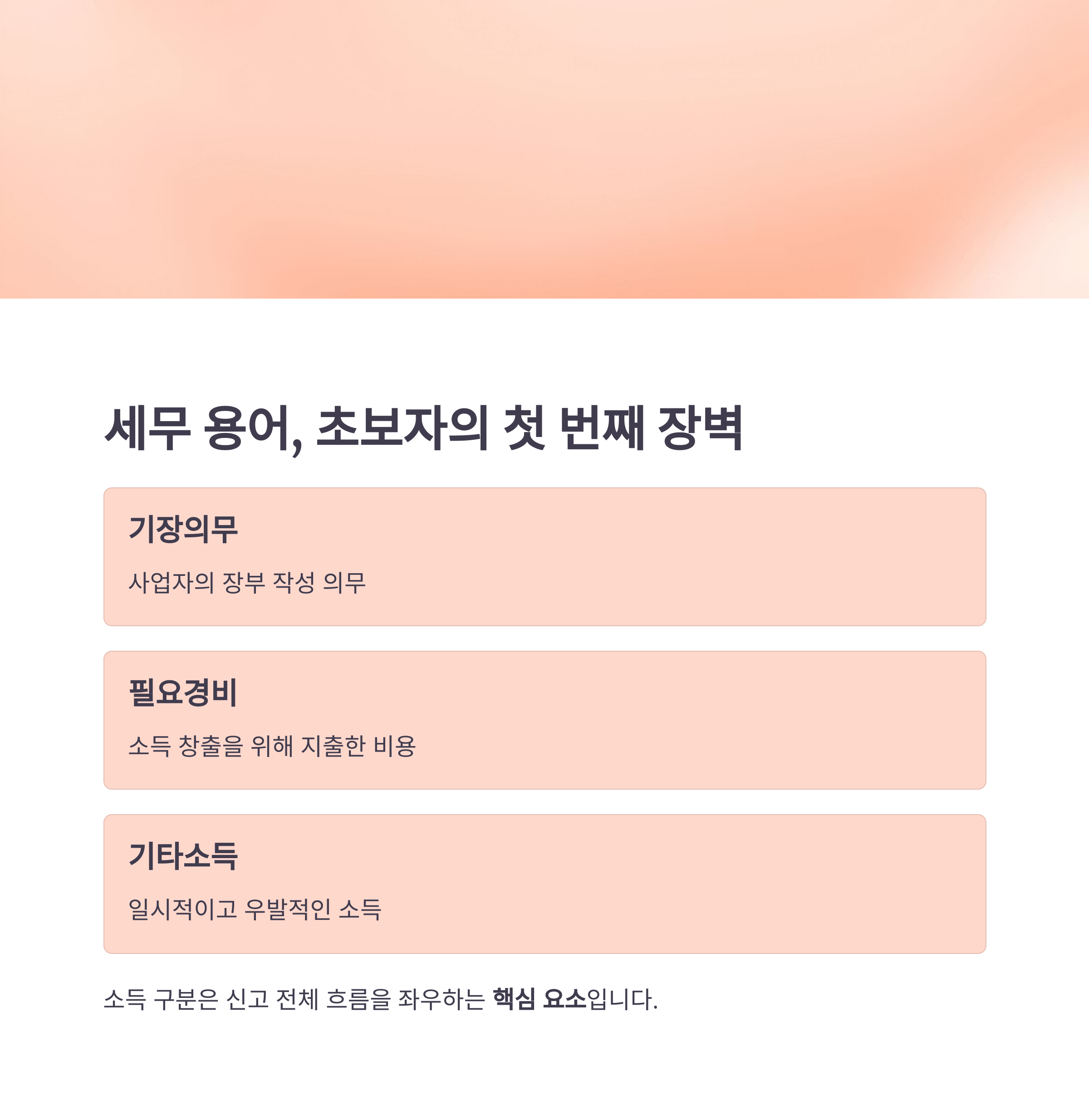 처음 종합소득세를 신고하는 이들에게 가장 큰 장애물은 다름 아닌 세무 용어에 대한 이해 부족입니다. 예를 들어, "기장의무", "필요경비", "기타소득" 같은 용어들은 직관적이지 않아 혼란을 줍니다.