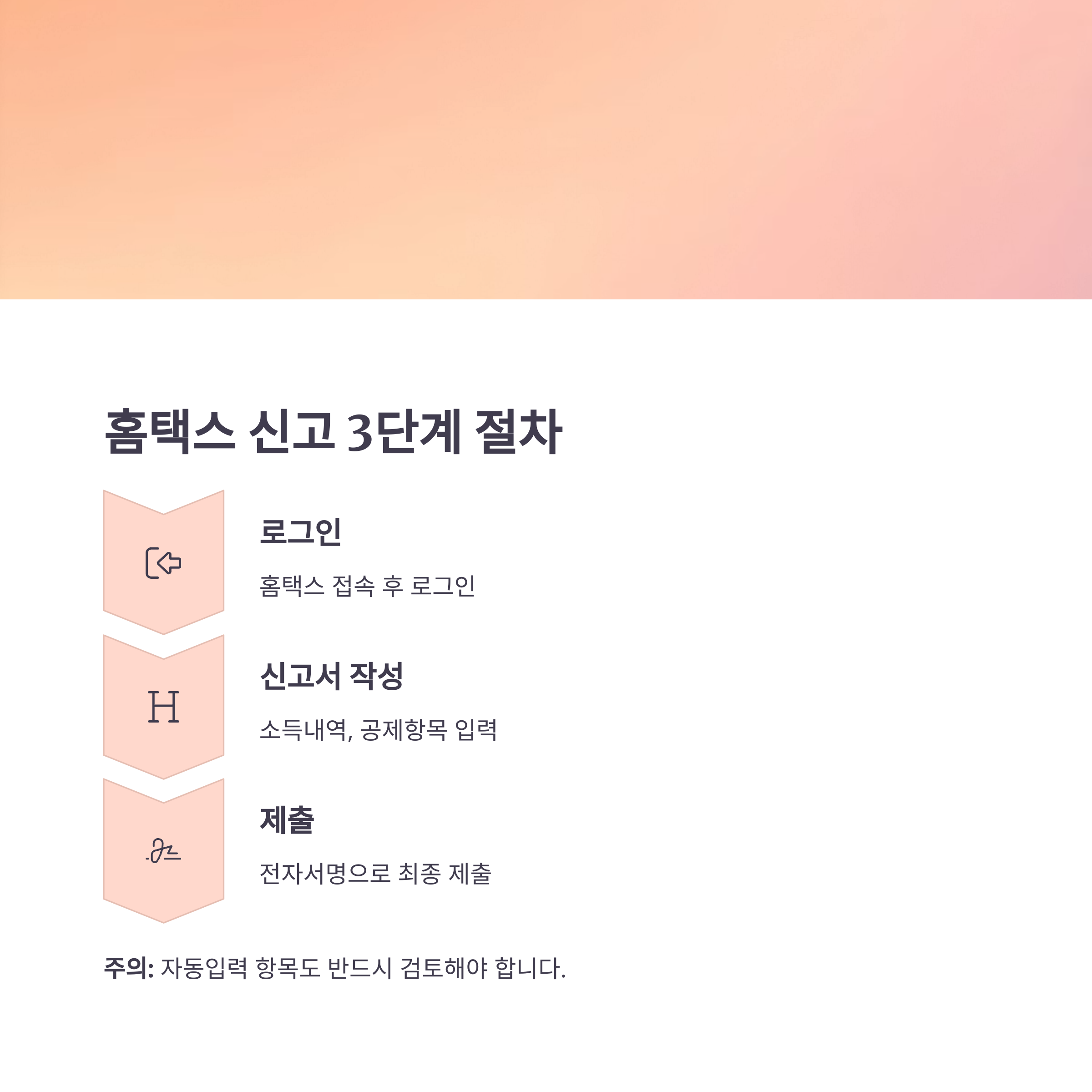 홈택스 종합소득세 신고는 크게 3단계로 구성됩니다. 먼저 로그인을 하고, 종합소득세 신고 메뉴에 들어가 맞춤형 신고서를 선택합니다. 이후 소득 내역, 공제 항목 등을 입력하고, 전자서명을 통해 제출합니다.