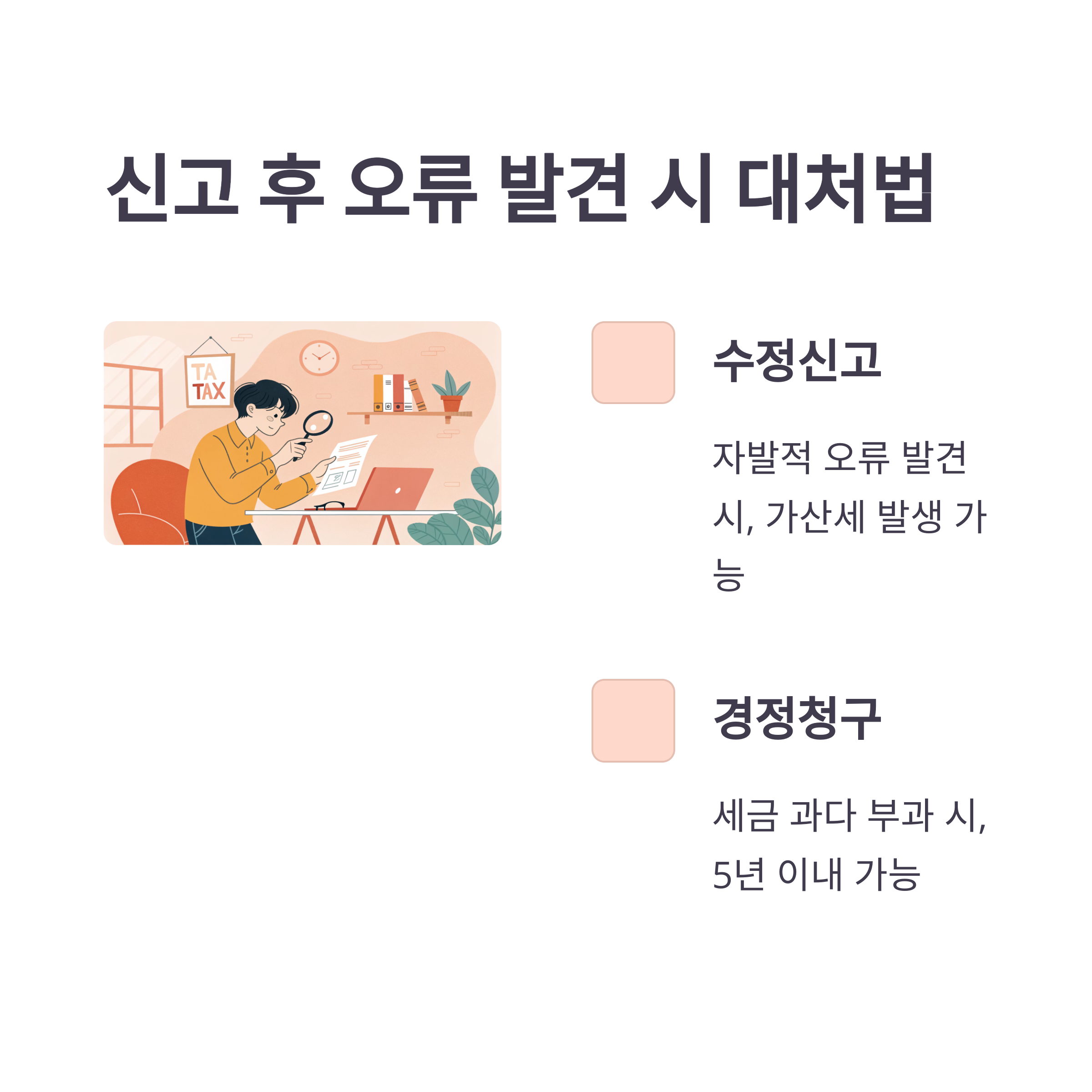 신고가 끝난 후에도 "내가 뭔가 빠뜨린 건 아닐까?" 걱정된다면 수정신고 또는 경정청구를 고려할 수 있습니다. 수정신고는 납세자가 자발적으로 오류를 발견했을 때, 경정청구는 세금이 과하게 부과된 경우 활용합니다.