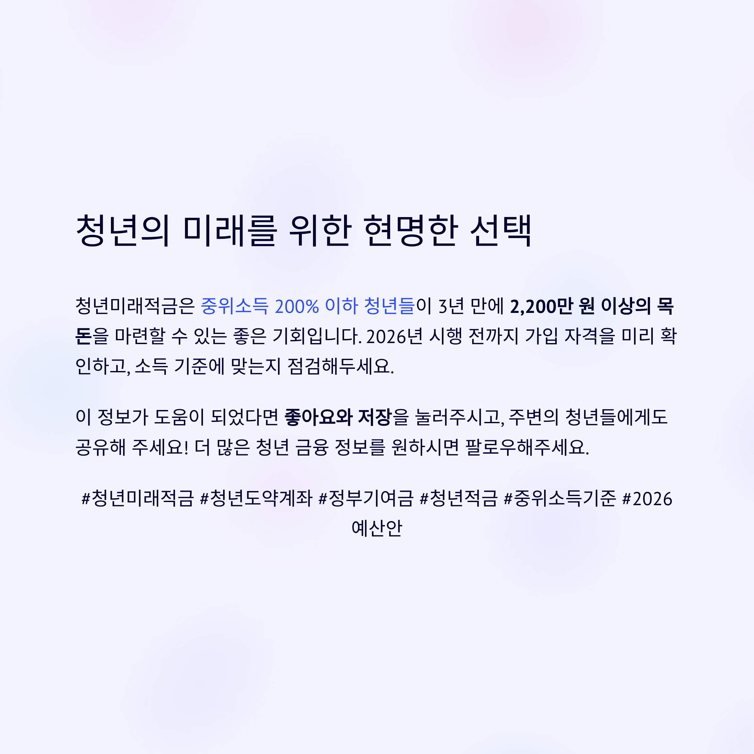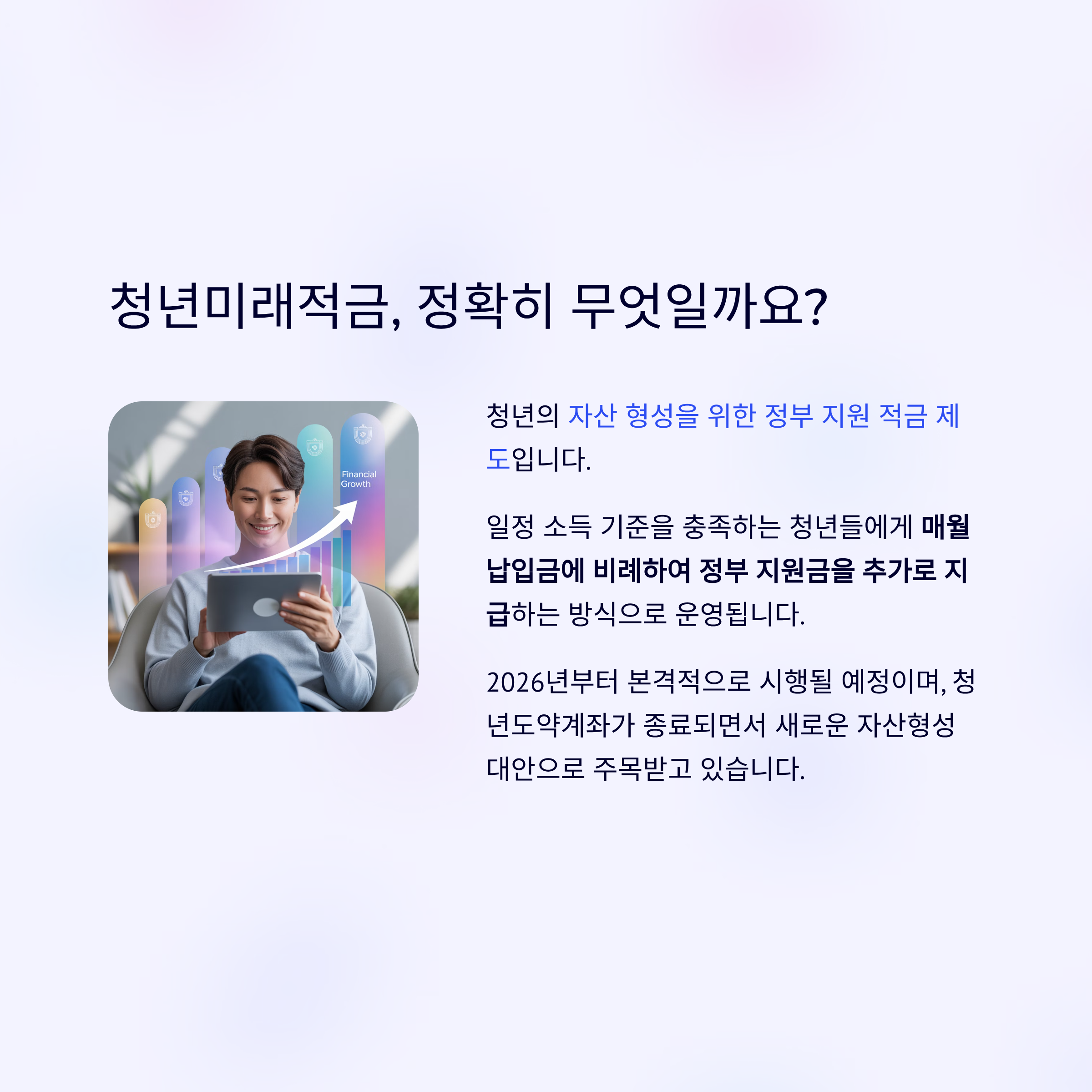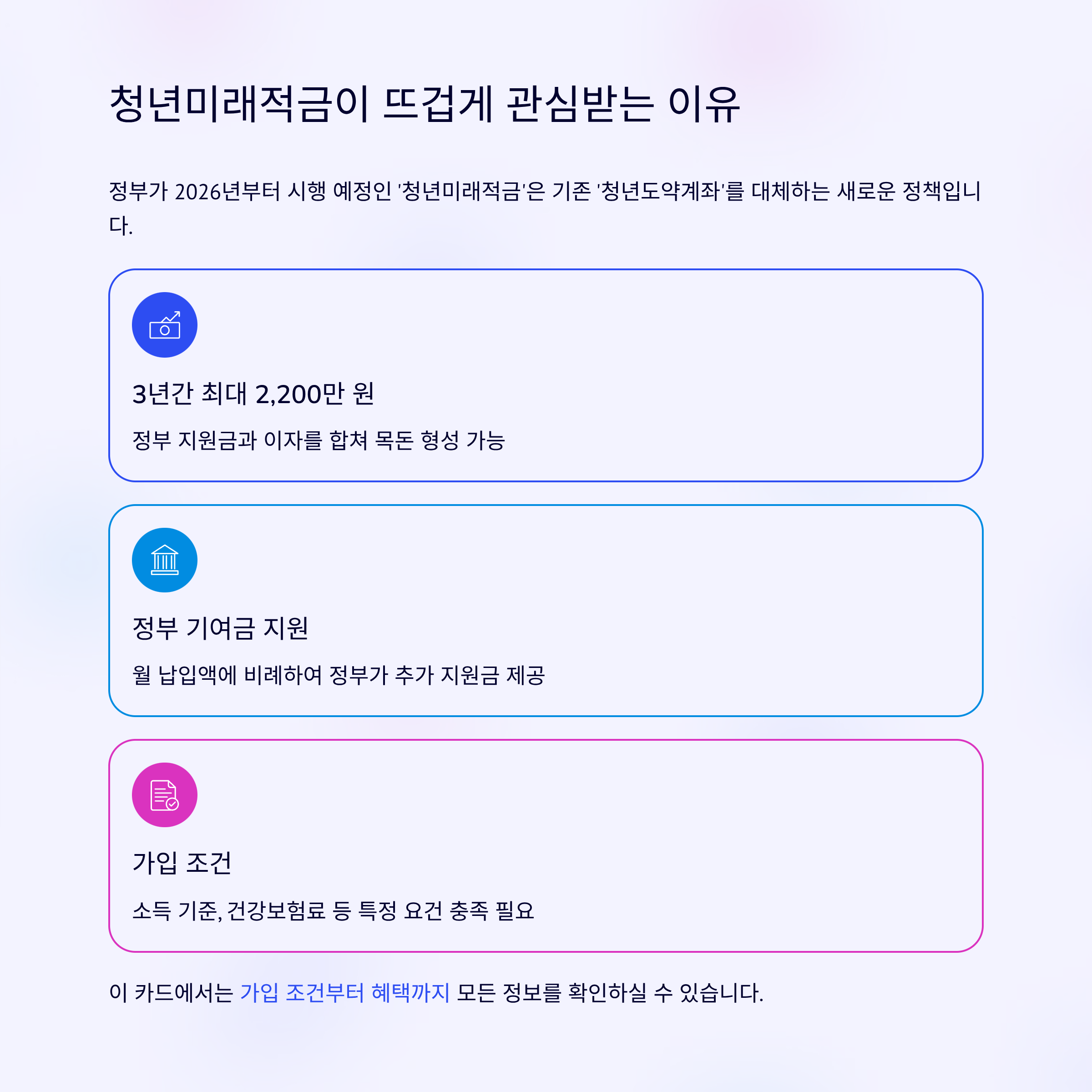 최근 정부가 2026년부터 본격 시행할 예정인 '청년미래적금'에 대한 관심이 뜨겁습니다. 특히 기존 '청년도약계좌'와의 차이점, 중복 가능 여부, 건강보험료 기준 등 궁금한 점이 많은데요. 이번 글에서는 청년미래적금의 가입 조건, 소득 기준, 정부 기여금, 혜택 총액, 신청 가능 시기까지 모든 정보를 한눈에 정리해드립니다. 3년간 최대 2,200만 원을 모을 수 있다는 말, 정말 가능할까요? 지금부터 함께 살펴보시죠.