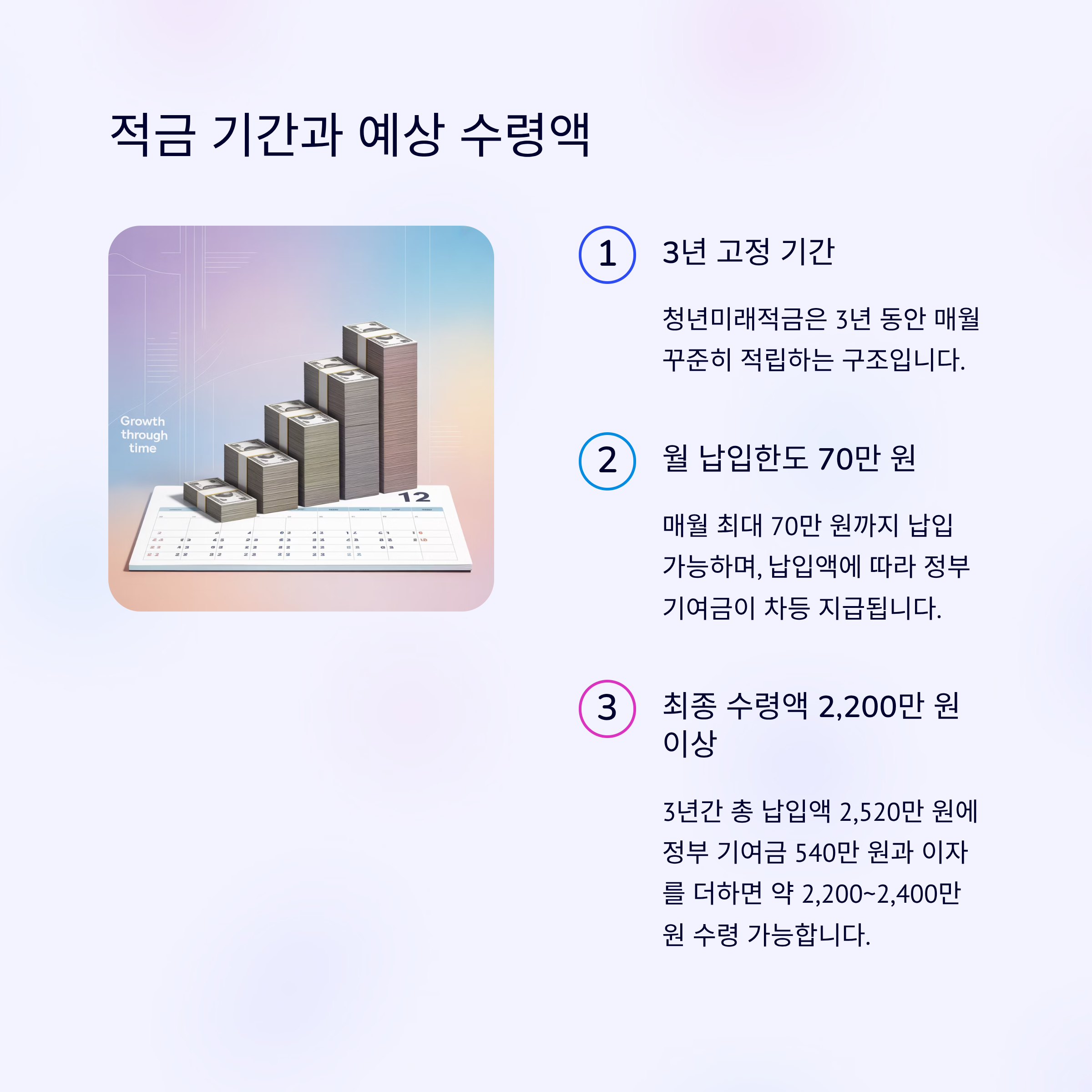 청년미래적금은 3년간 매월 꾸준히 적립하는 구조입니다.
