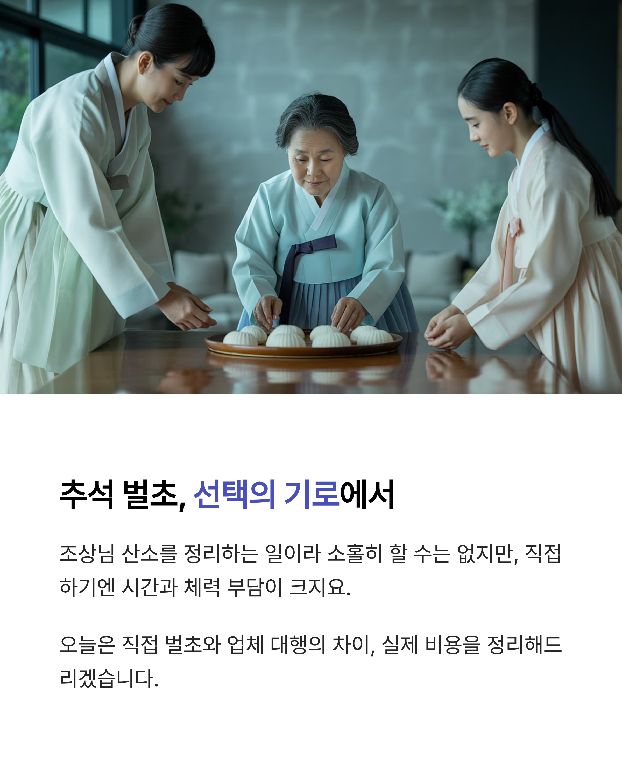 | 직접 벌초 | 장비 준비 시 5만 원 내외 |