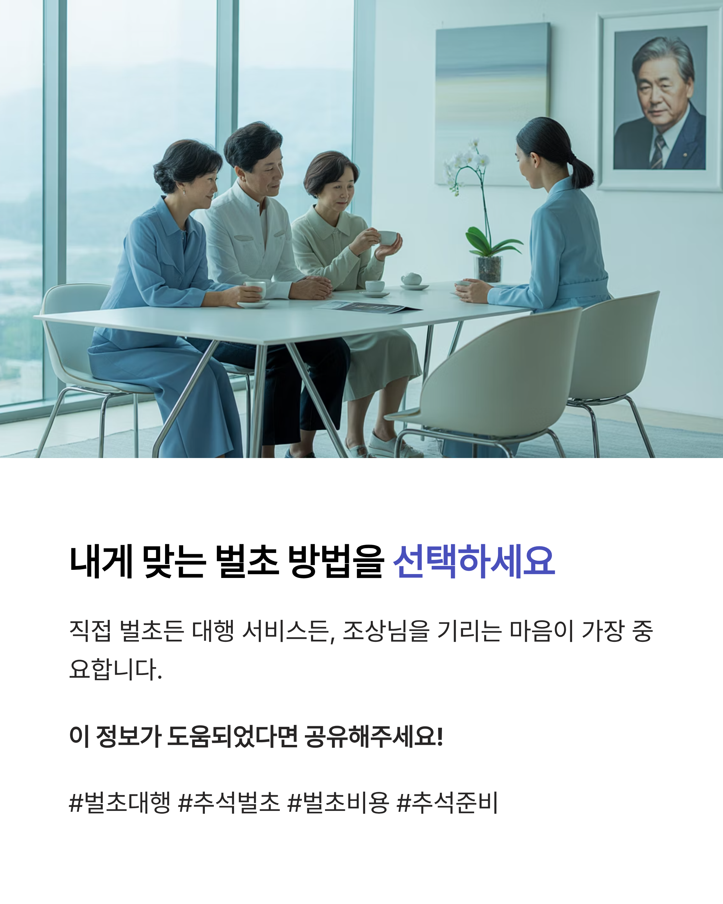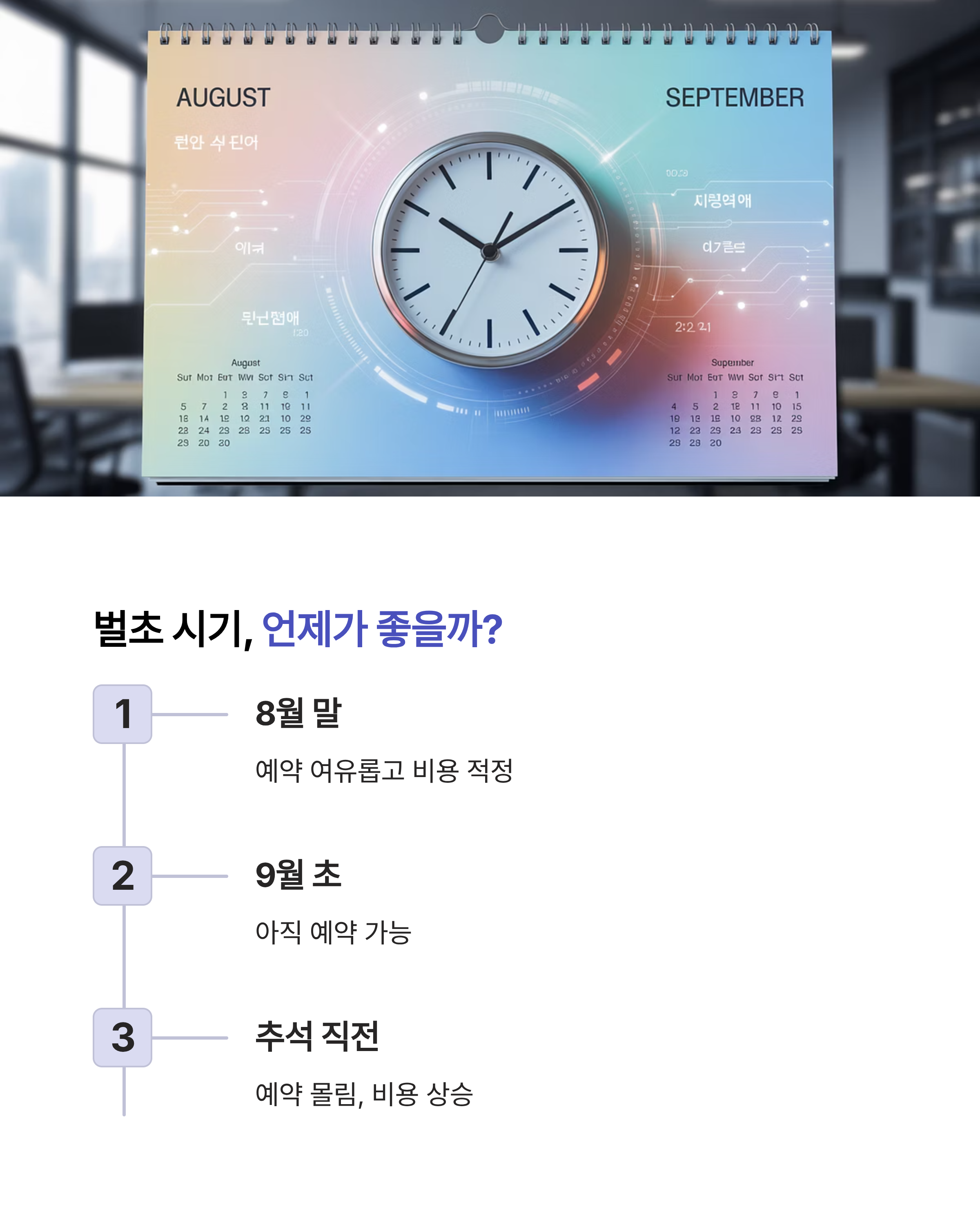 추석 직전은 업체 예약이 몰리기 때문에 비용이 오르거나 원하는 날짜에 못 맡길 수 있습니다. 보통 8월 말에서 9월 초 사이 미리 진행하는 것이 수월합니다.