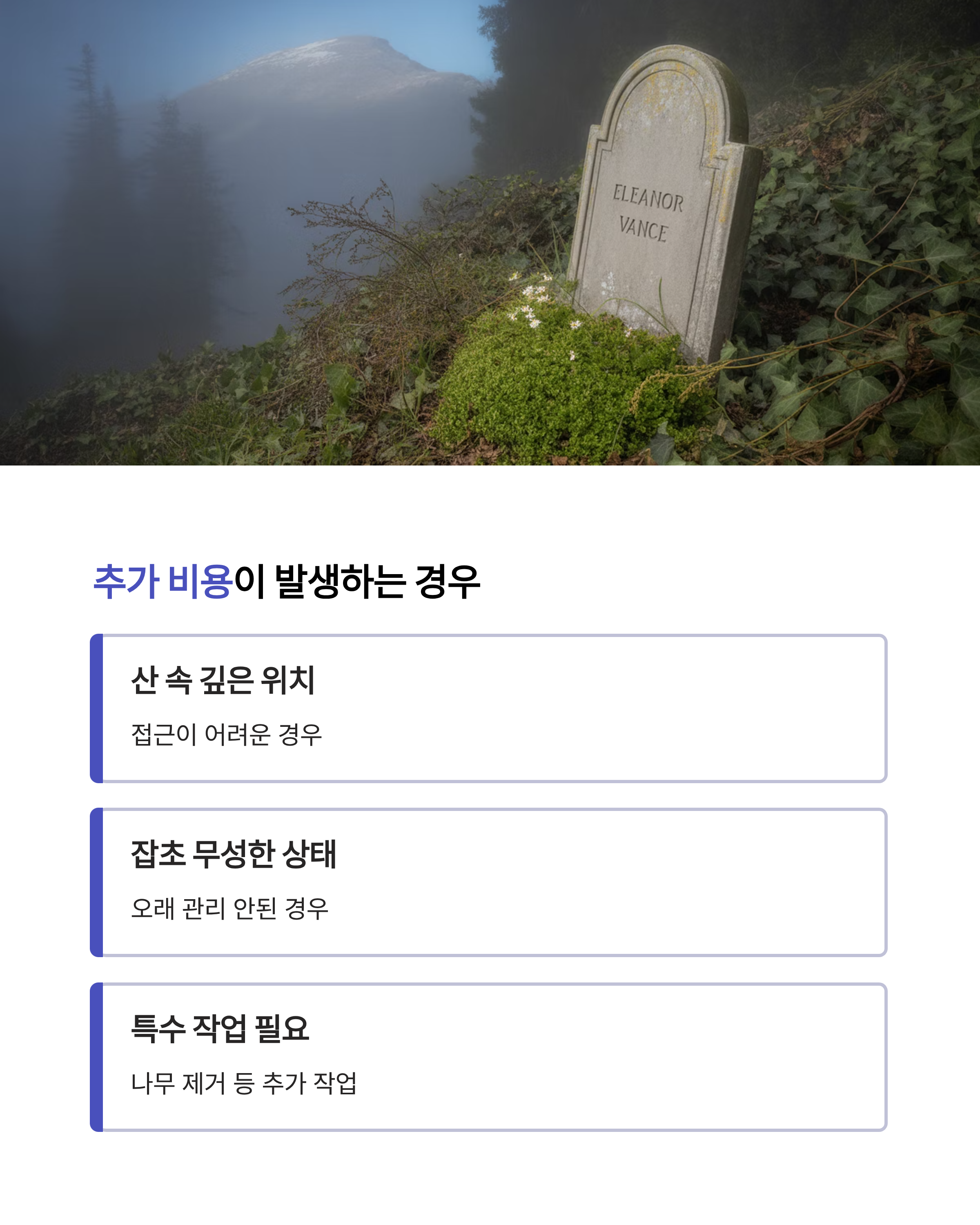 묘가 산 속 깊은 곳에 있거나, 관리가 오래 안 되어 잡초가 무성한 경우에는 추가 비용이 붙을 수 있습니다. 업체마다 조건이 다르니 미리 확인하는 것이 좋습니다.