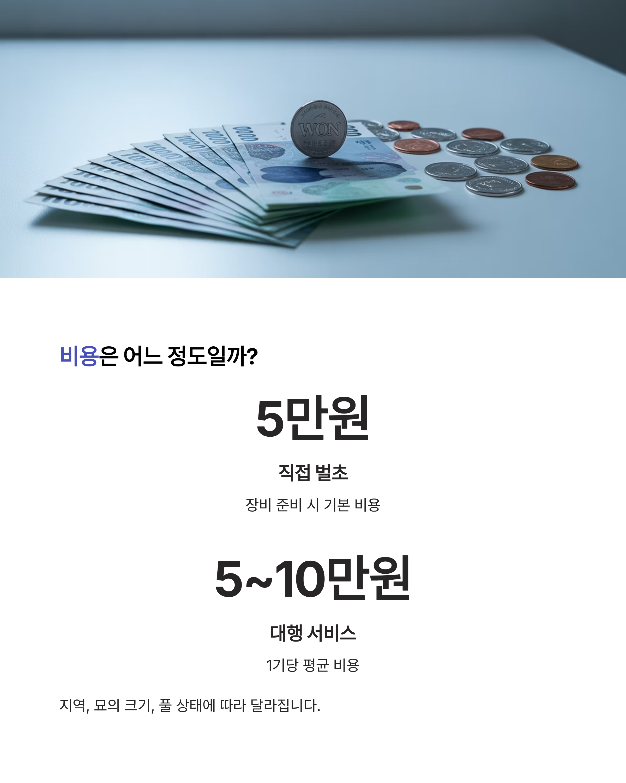 일반적으로 1기당 약 5만 원에서 10만 원 선입니다. 지역, 묘의 크기, 풀 상태에 따라 달라지지만 기본 단가는 큰 차이가 없습니다.
