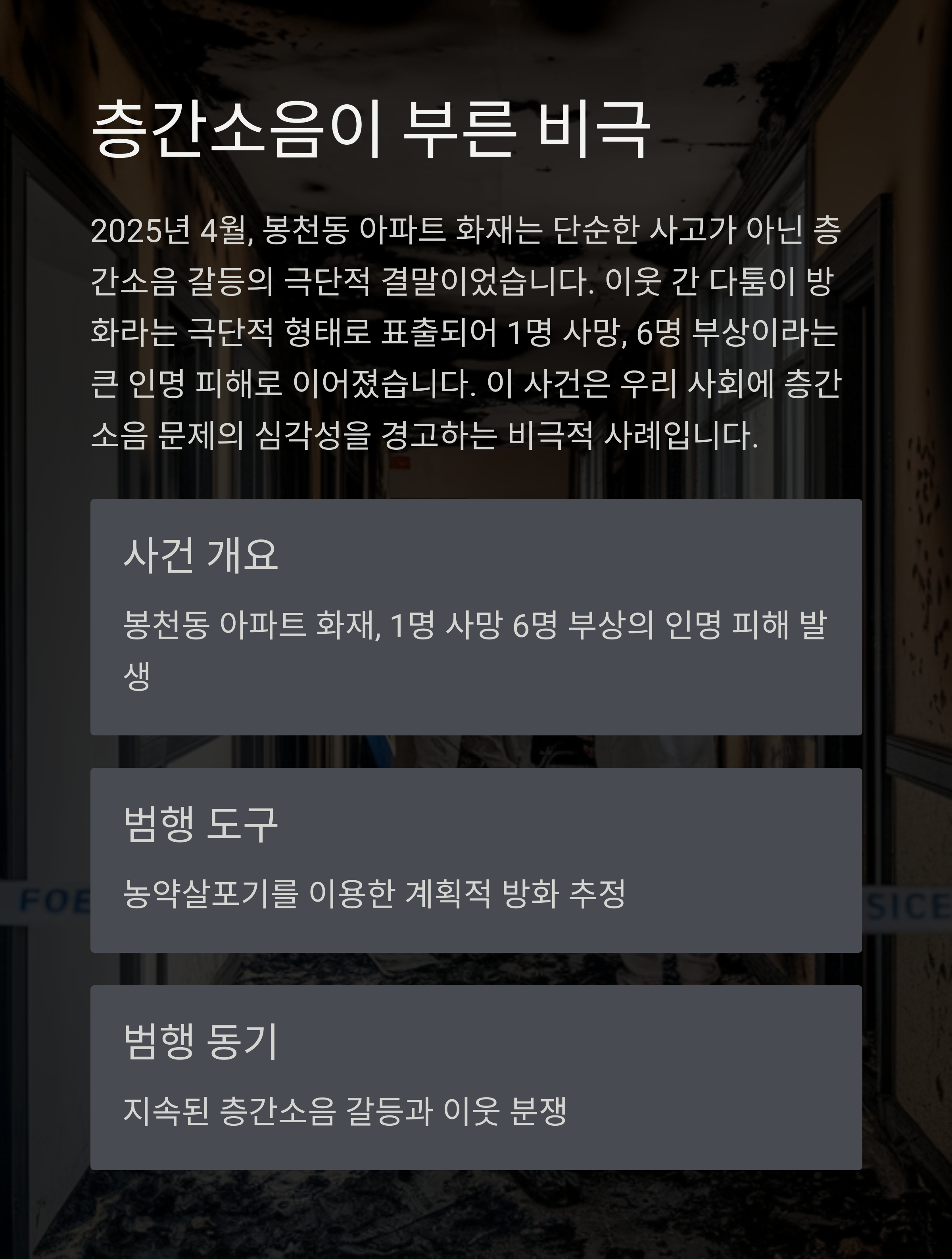 봉천동 방화 사건은 층간소음 갈등이 극단적 범죄로 번질 수 있음을 경고한다. 이웃 간의 작은 불편이 쌓여 악연이 되고, 결국 모두에게 상처만 남긴다. 법적·제도적 장치와 함께, 서로를 이해하고 배려하는 문화가 절실하다. 오늘도 고통받는 이웃들이 더 이상 생기지 않도록, 우리 모두의 노력이 필요하다.