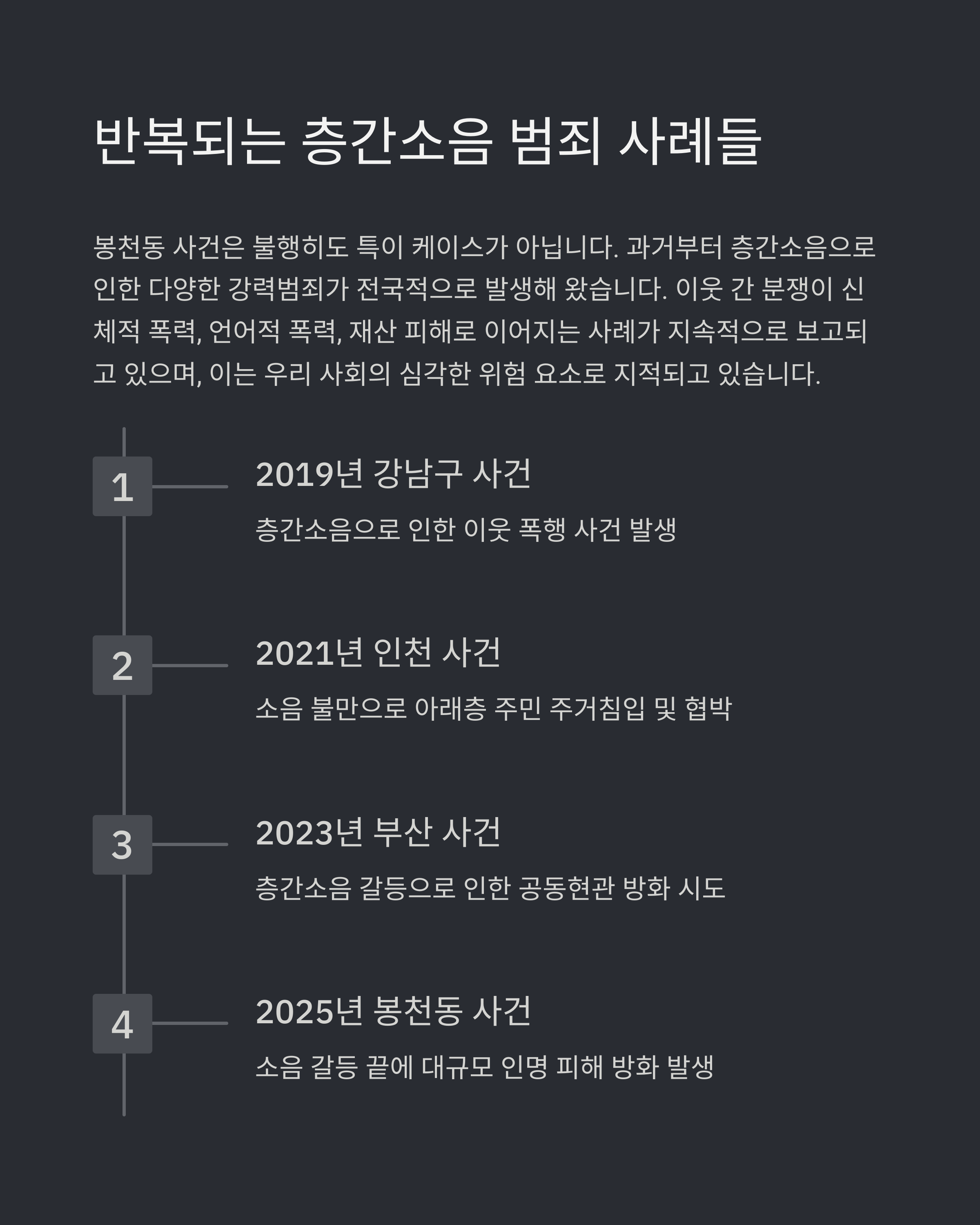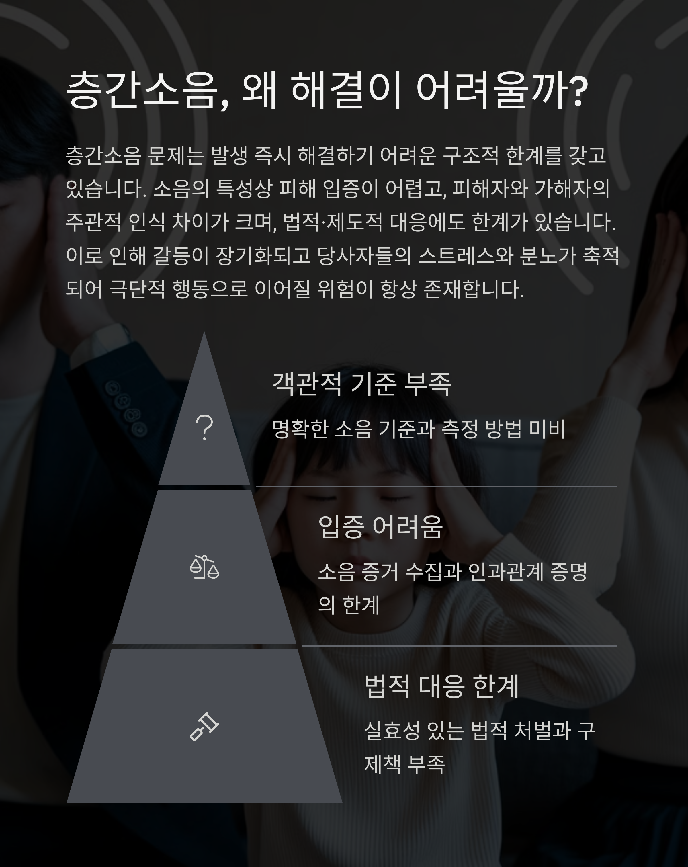 층간소음 문제는 더 이상 개인 간의 사소한 분쟁이 아니다. 국민 65%가 공동주택에 거주하는 현실에서, 누구나 피해자 또는 가해자가 될 수 있다. 반복되는 참극을 막으려면,