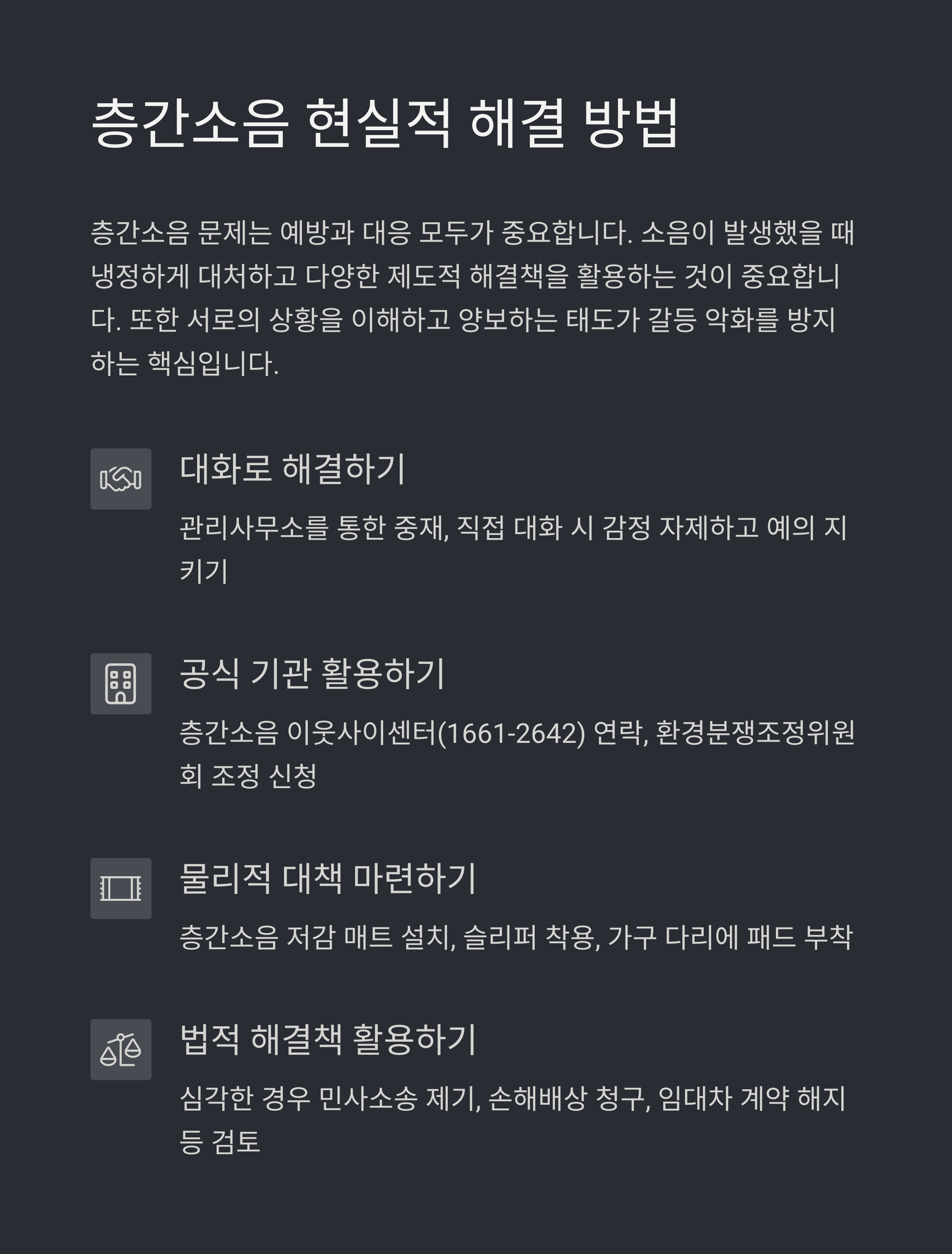 감정적 대응을 피하고, 관리사무소 등 중립 기관을 통한 대화가 우선이다. - 2차: 공식 소음 측정 및 외부 기관 조정
