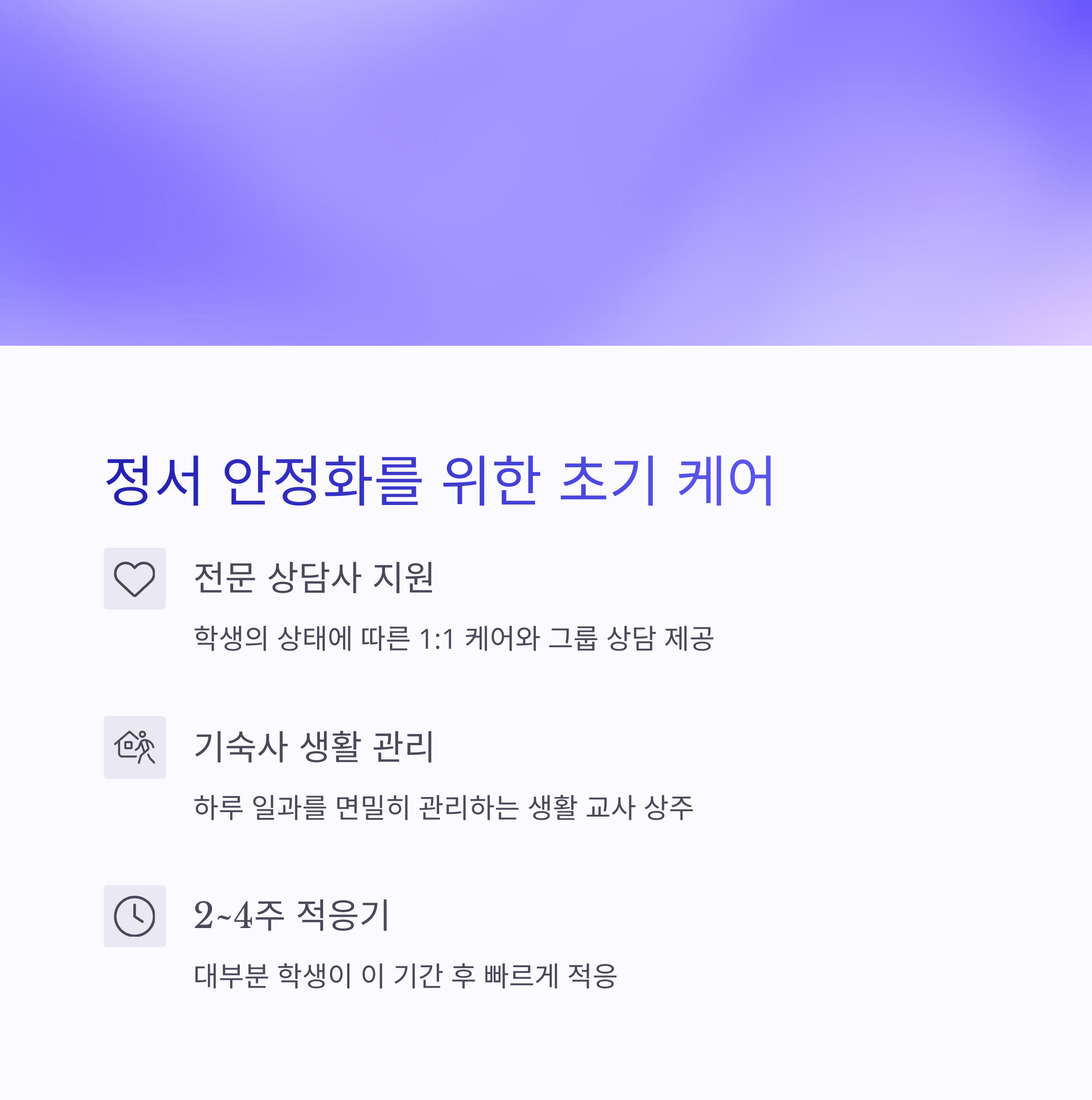 학생의 상태에 따라 1:1 케어, 그룹 상담, 심리 워크숍도 병행합니다.