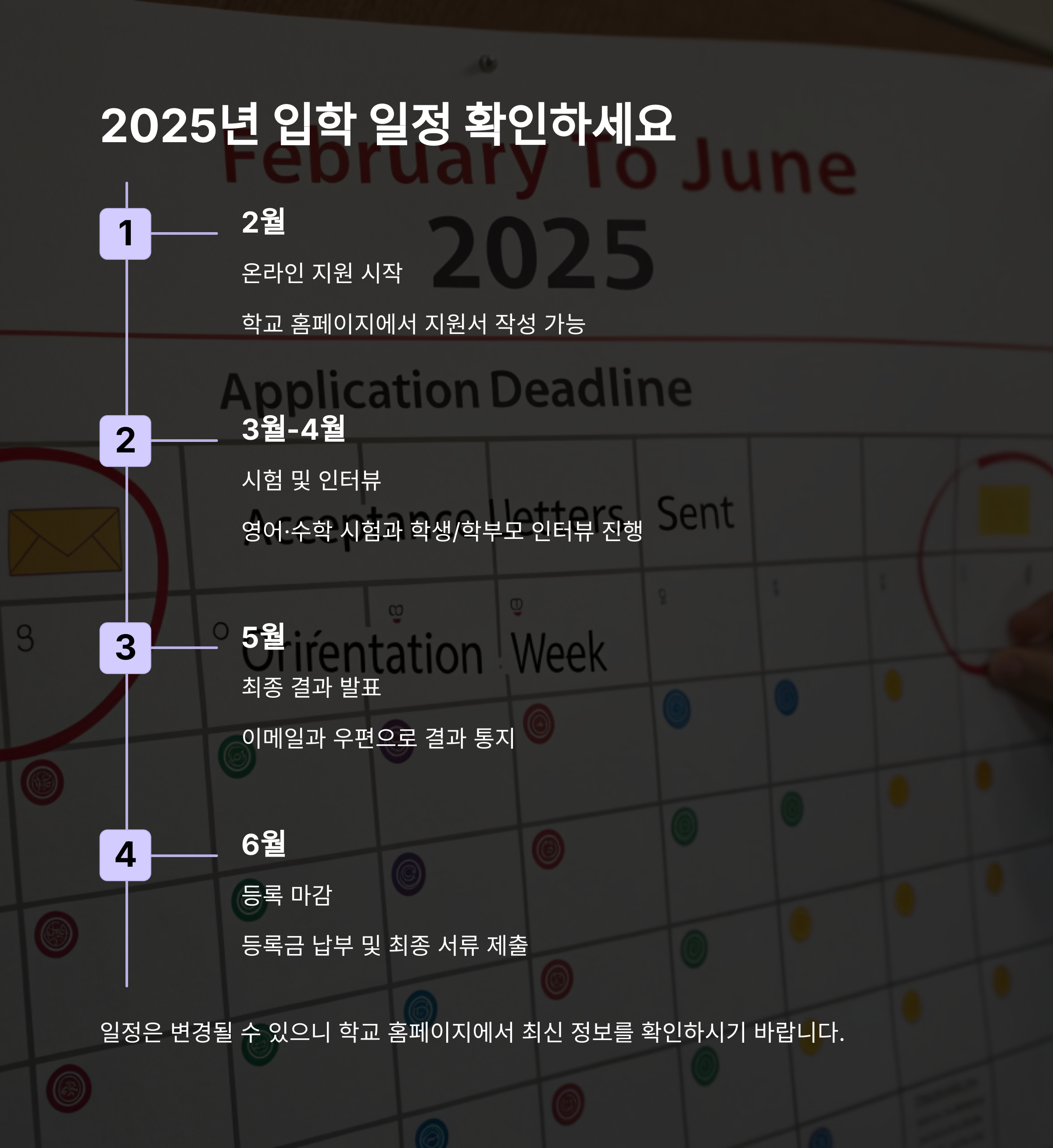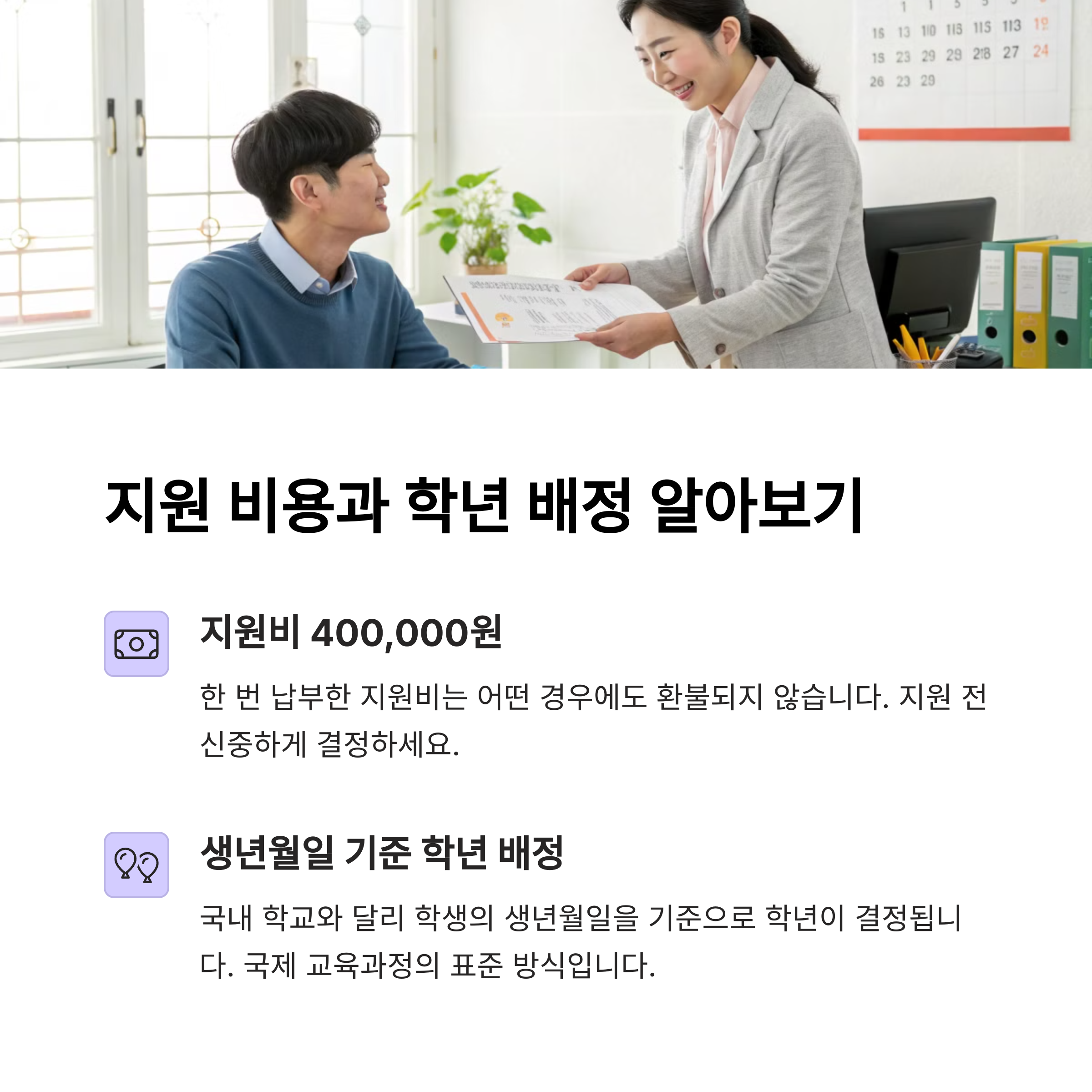 | 지원비는 환불 불가이며, 송금 시 학년과 성을 명시해야 합니다. | 입학 평가 후, 최종 합격 여부가 결정됩니다. | 한국 국적자는 반드시 한국 여권을 제출해야 하며, 여권 갱신 중인 경우 증빙 서류가 필요합니다. |