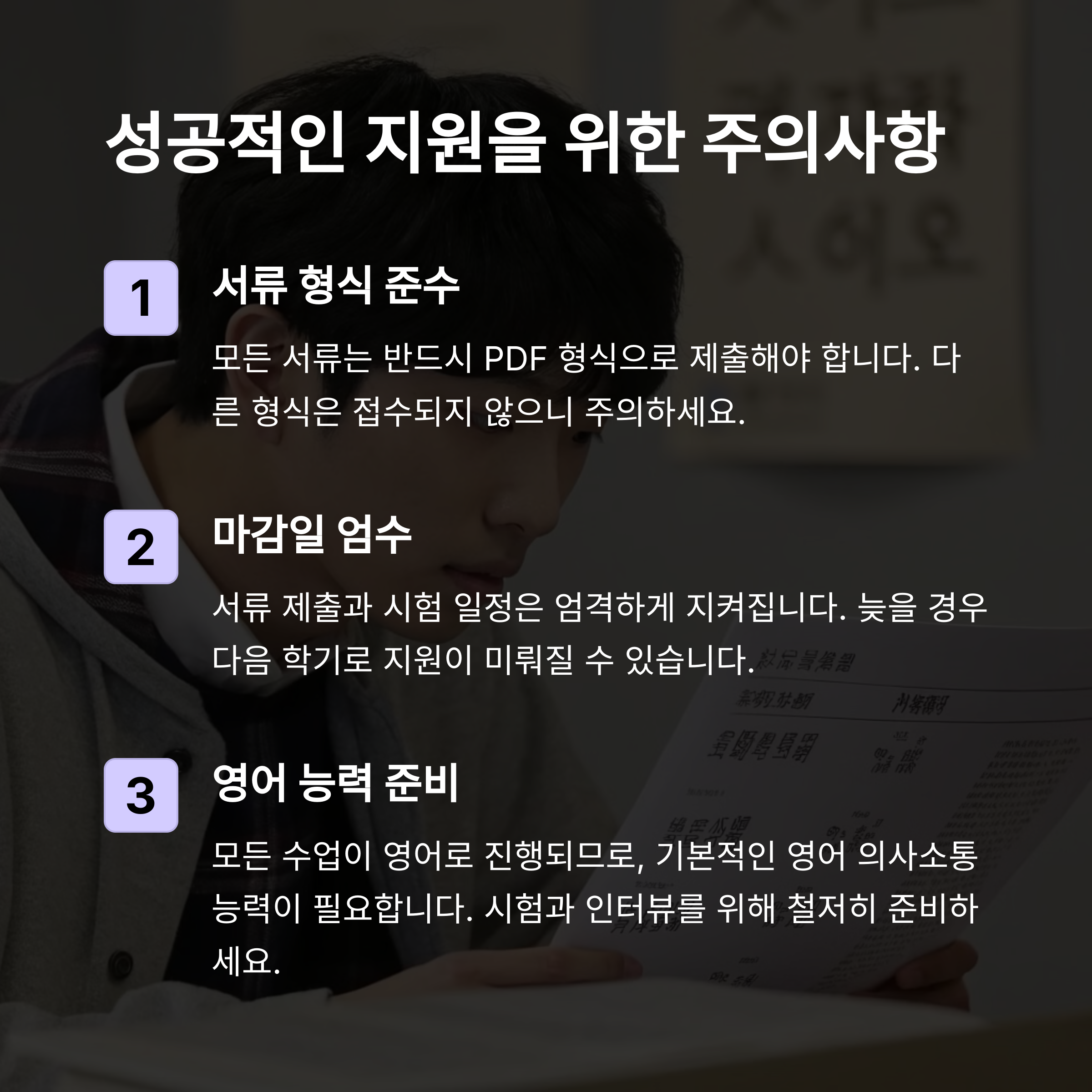 입학 결과 발표 후 등록 절차는 빠르게 진행되어야 하며, 등록비와 학비 납부 마감은 2025년 6월 2일입니다. 또한, 지원자는 제출 서류의 정확성에 유의해야 하며, 서류 누락이나 부정확한 정보 제출은 불합격 사유가 될 수 있습니다. 특히, 여권이나 재학 증명서 등의 서류는 반드시 최신으로 제출해야 합니다.