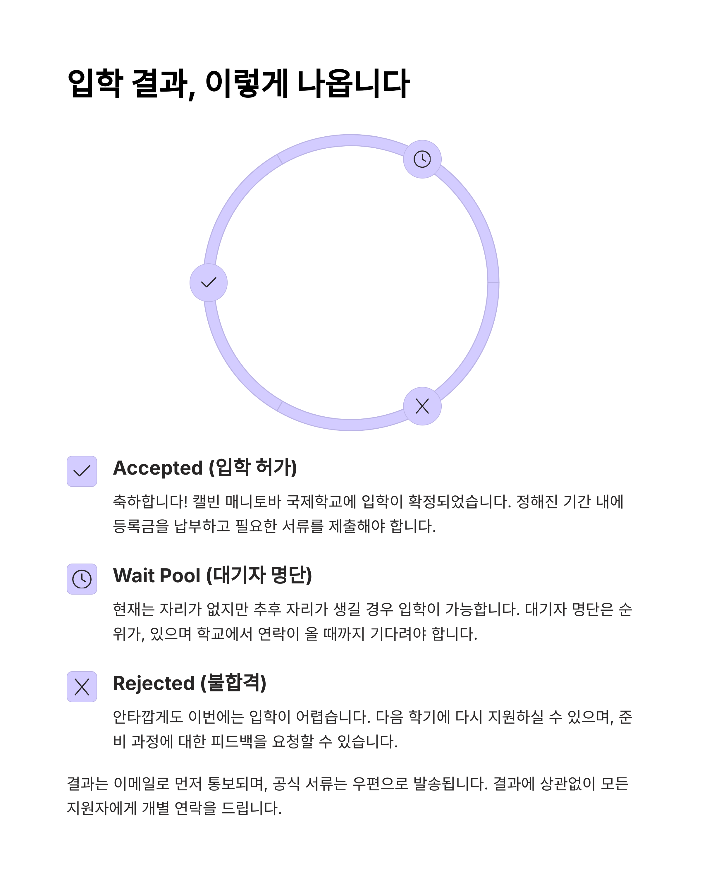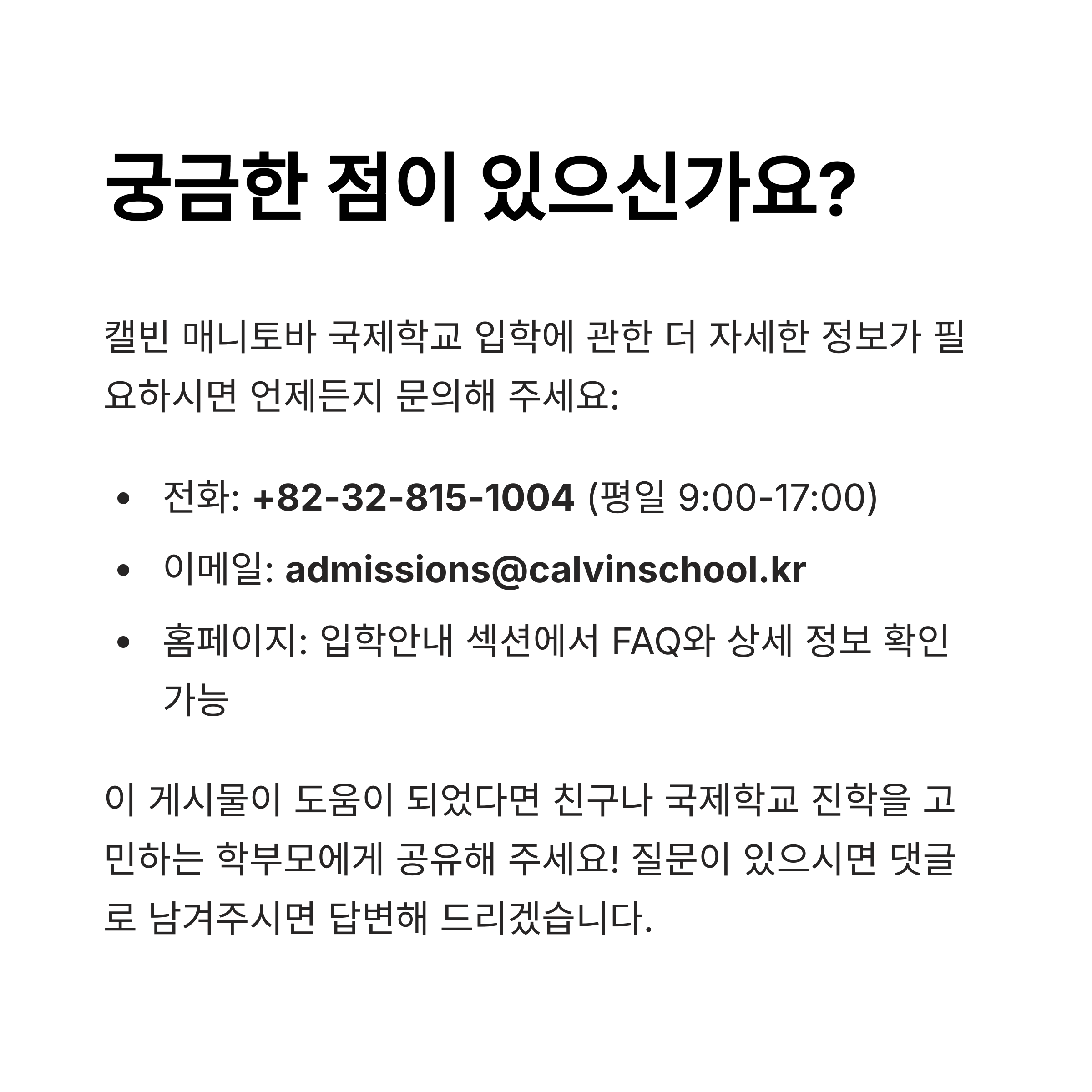 캘빈 매니토바 국제학교(Calvin Manitoba International School)의 2025-2026학년도 정규 입학 절차는 세부적인 단계와 엄격한 요구사항으로 구성되어 있습니다. 아래는 입학 과정, 제출 서류, 일정 및 기타 주요 사항을 정리한 내용입니다.