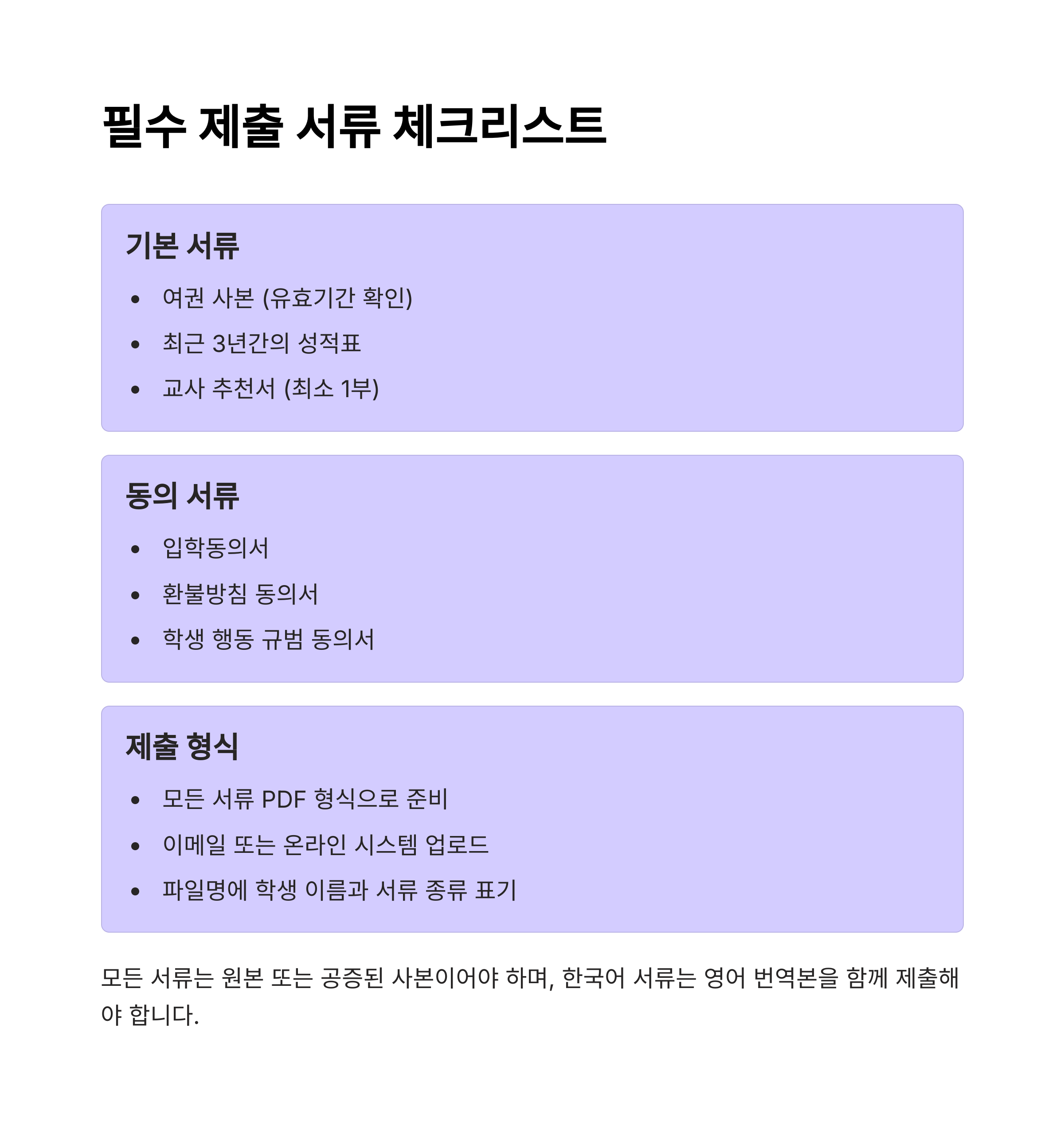 | 필수 서류 | 여권, 성적표, 교사 추천서 등 제출 필요 |