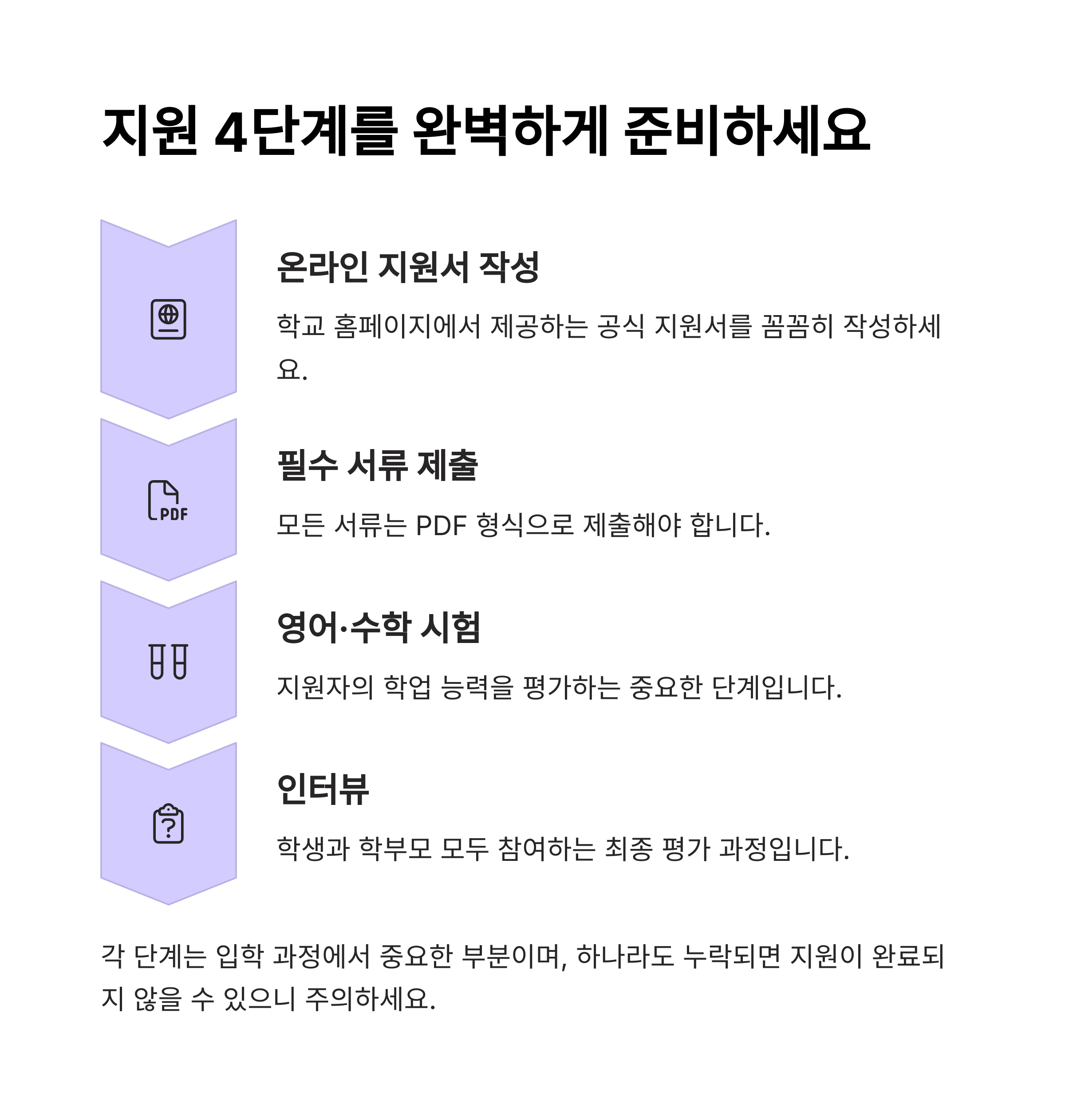 입학 절차는 온라인 지원서 작성에서부터 시작하여, 각 단계별로 평가가 이루어집니다. 영어 및 수학 시험은 필수적으로 진행되며, 특히 G3 이상의 학년에서는 학력 평가가 중요합니다. 면접 단계에서는 학생의 태도와 학업에 대한 자세를 평가하며, K-G2 학년은 부모님과 함께 인터뷰를 진행해야 합니다. 모든 입학 결과는 학교 웹사이트에서 확인할 수 있으며, 최종 합격자는 등록 절차를 밟아야 합니다.