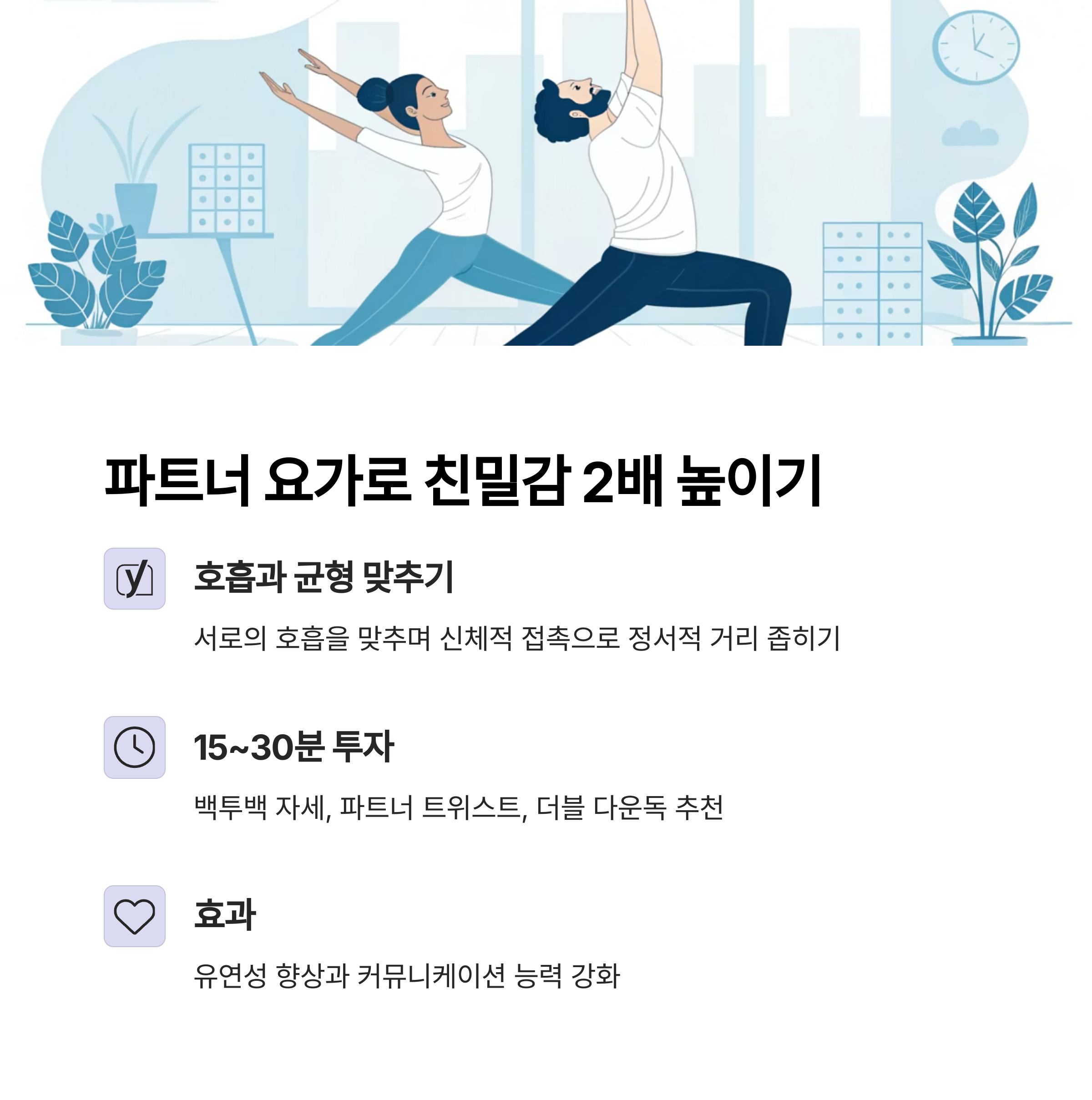 - 추천 동작: 백투백 자세, 파트너 트위스트, 더블 다운독