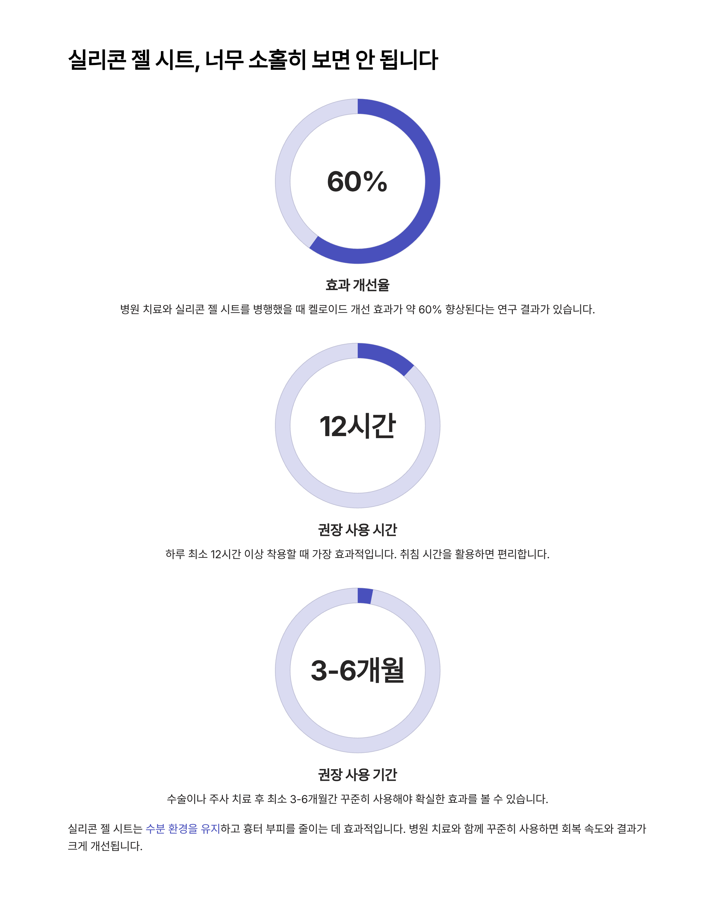 실리콘 젤 시트나 젤 제품을 집에서 꾸준히 사용하는 것이 회복 속도와 결과를 좌우합니다.