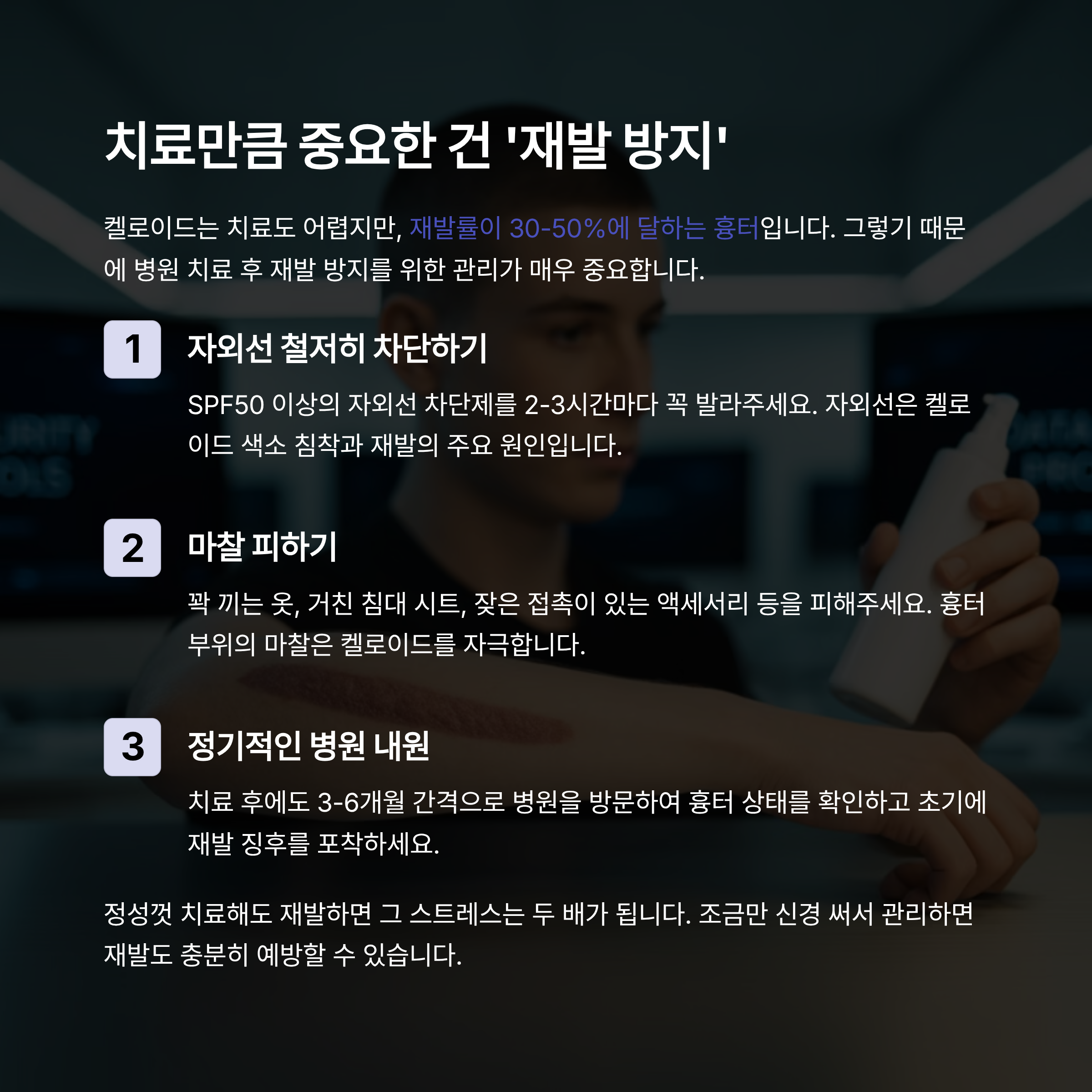 켈로이드는 치료도 어렵지만, 재발도 매우 흔한 흉터입니다.