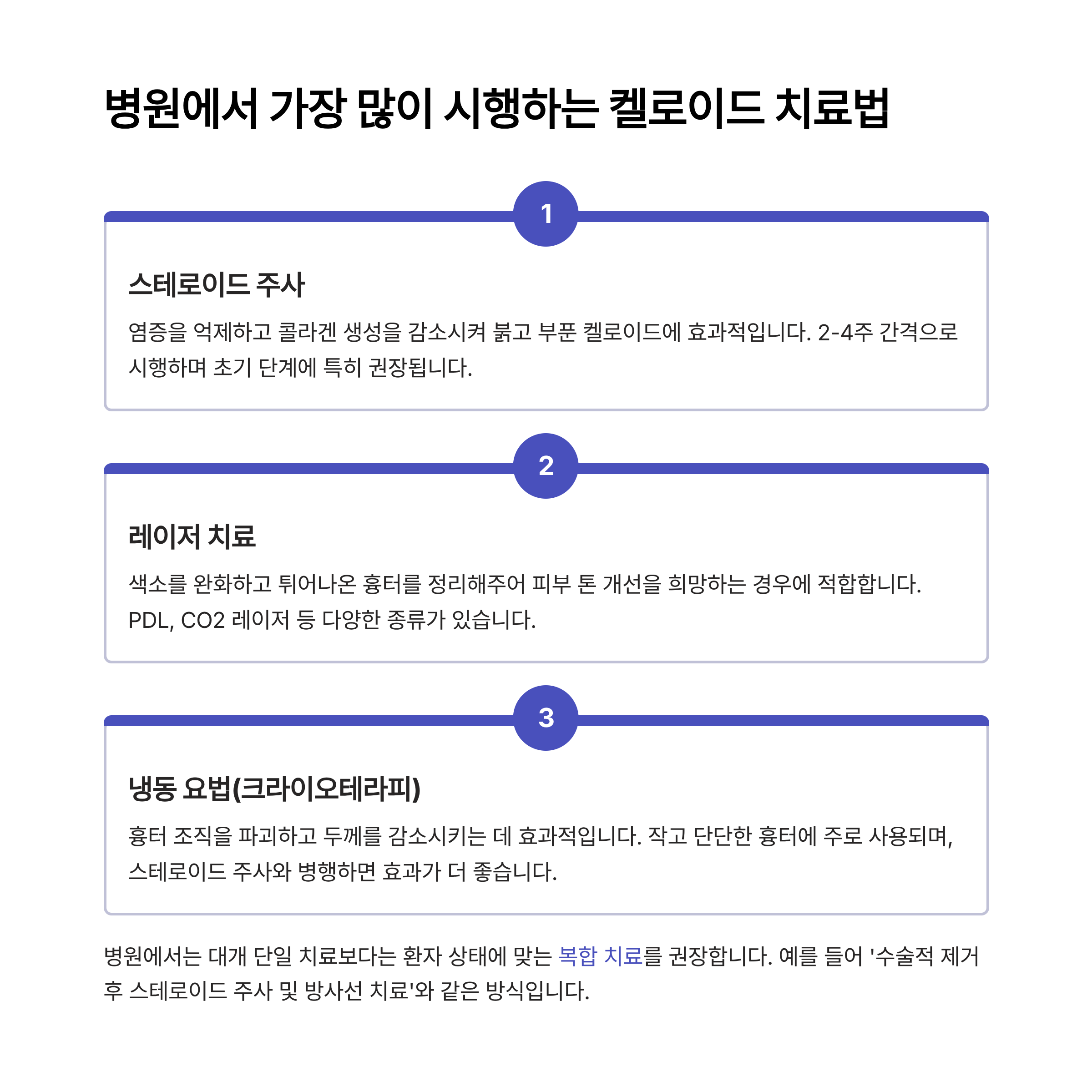 | 스테로이드 주사 | 염증 억제, 콜라겐 생성을 감소시킴 | 붉고 부푼 켈로이드 초기 단계 |