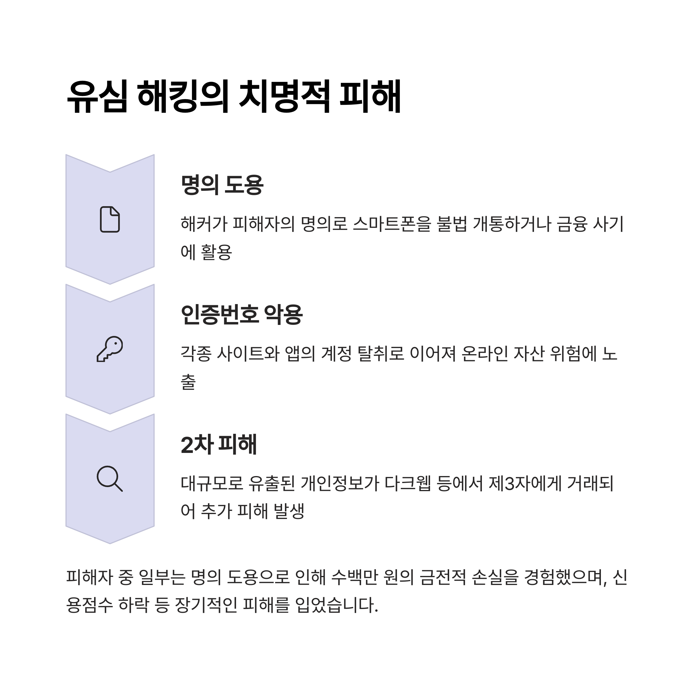 첫째, 금융 계좌 탈취로 인한 직접 금전 피해가 발생합니다