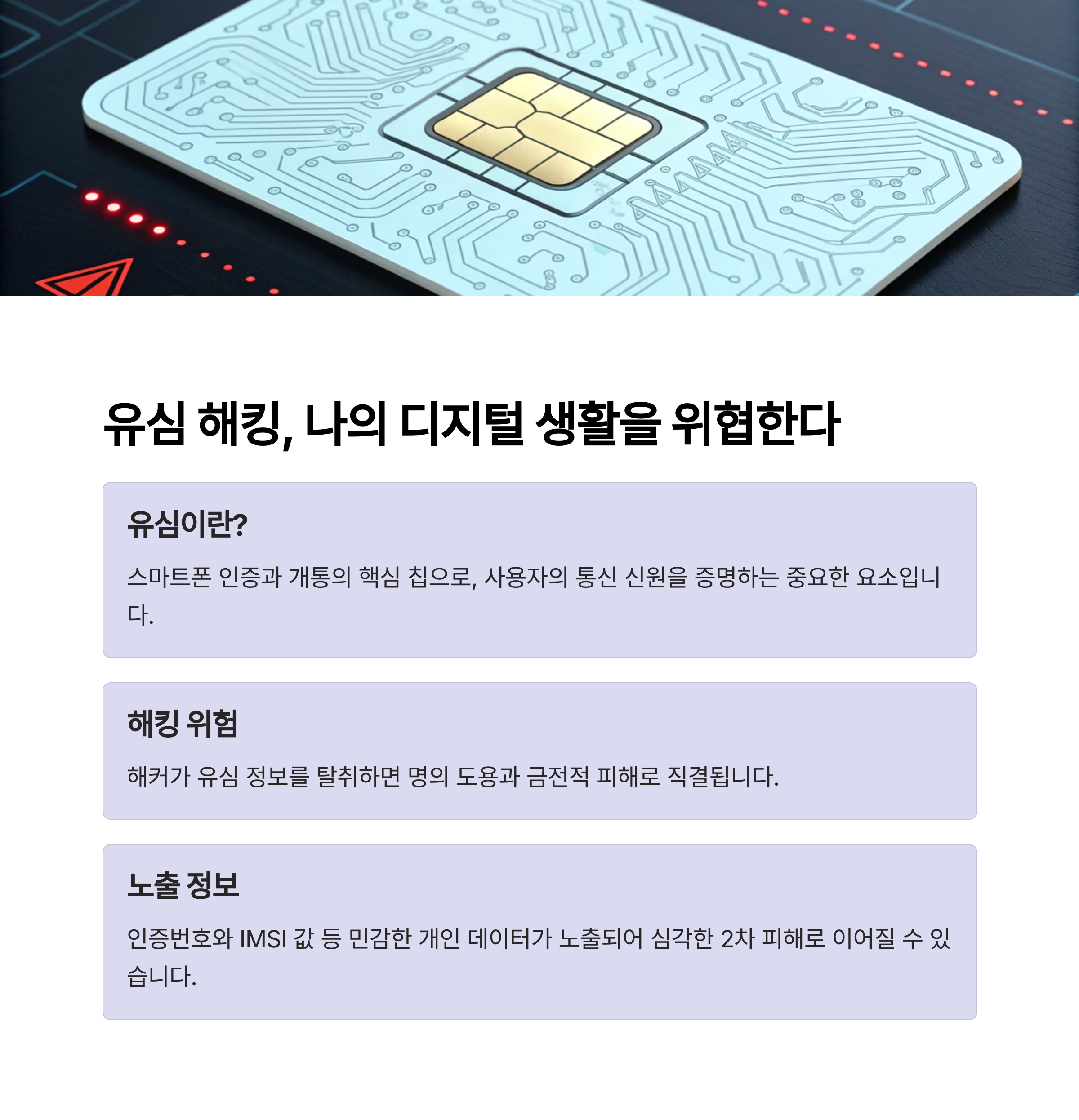 "유심 해킹은 단순한 개인정보 유출이 아니라, 직접적인 금전 피해로 이어질 수 있어 매우 위험합니다"