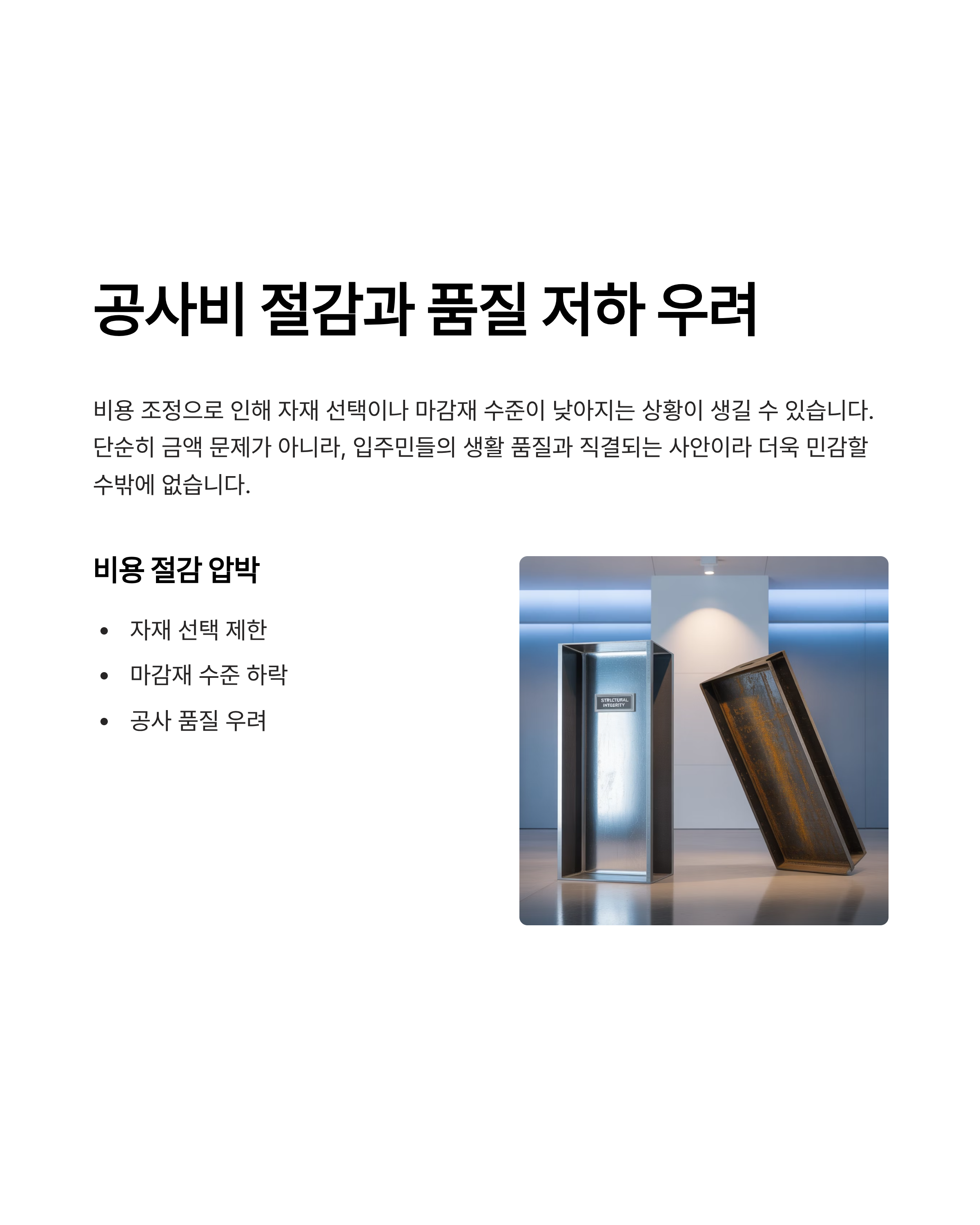 비용 조정으로 인해 자재 선택이나 마감재 수준이 낮아지는 상황이 생길 수 있습니다. 단순히 금액 문제가 아니라, 입주민들의 생활 품질과 직결되는 사안이라 더욱 민감할 수밖에 없습니다.