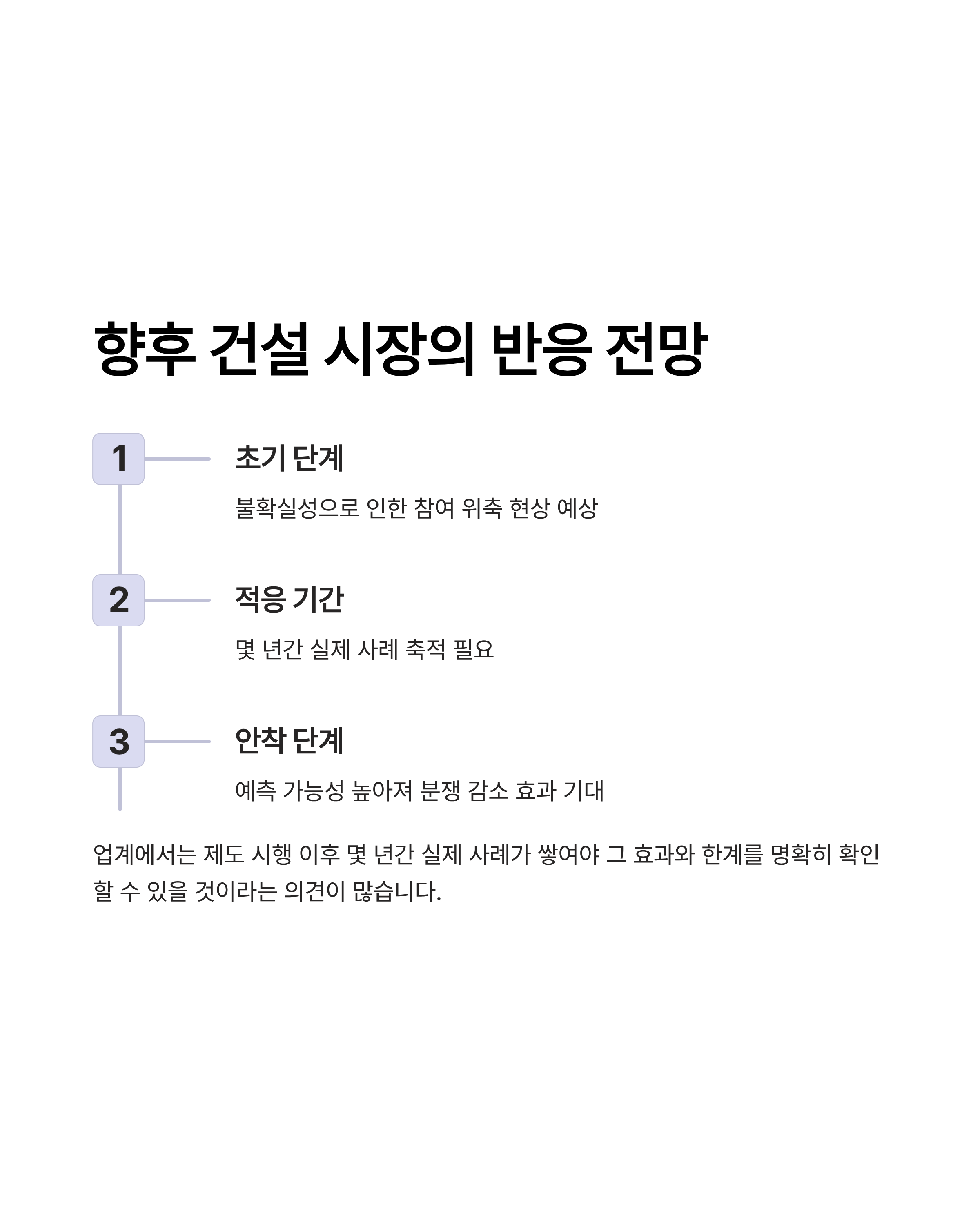 업계에서는 제도 시행 이후 몇 년간 실제 사례가 쌓여야 그 효과와 한계를 명확히 확인할 수 있을 것이라는 의견이 많습니다. 초기에는 불확실성으로 인해 참여 위축 현상이 나타날 수 있지만, 제도 운영이 안착되면 오히려 예측 가능성이 높아져 장기적으로는 분쟁 감소 효과가 나타날 수도 있습니다.