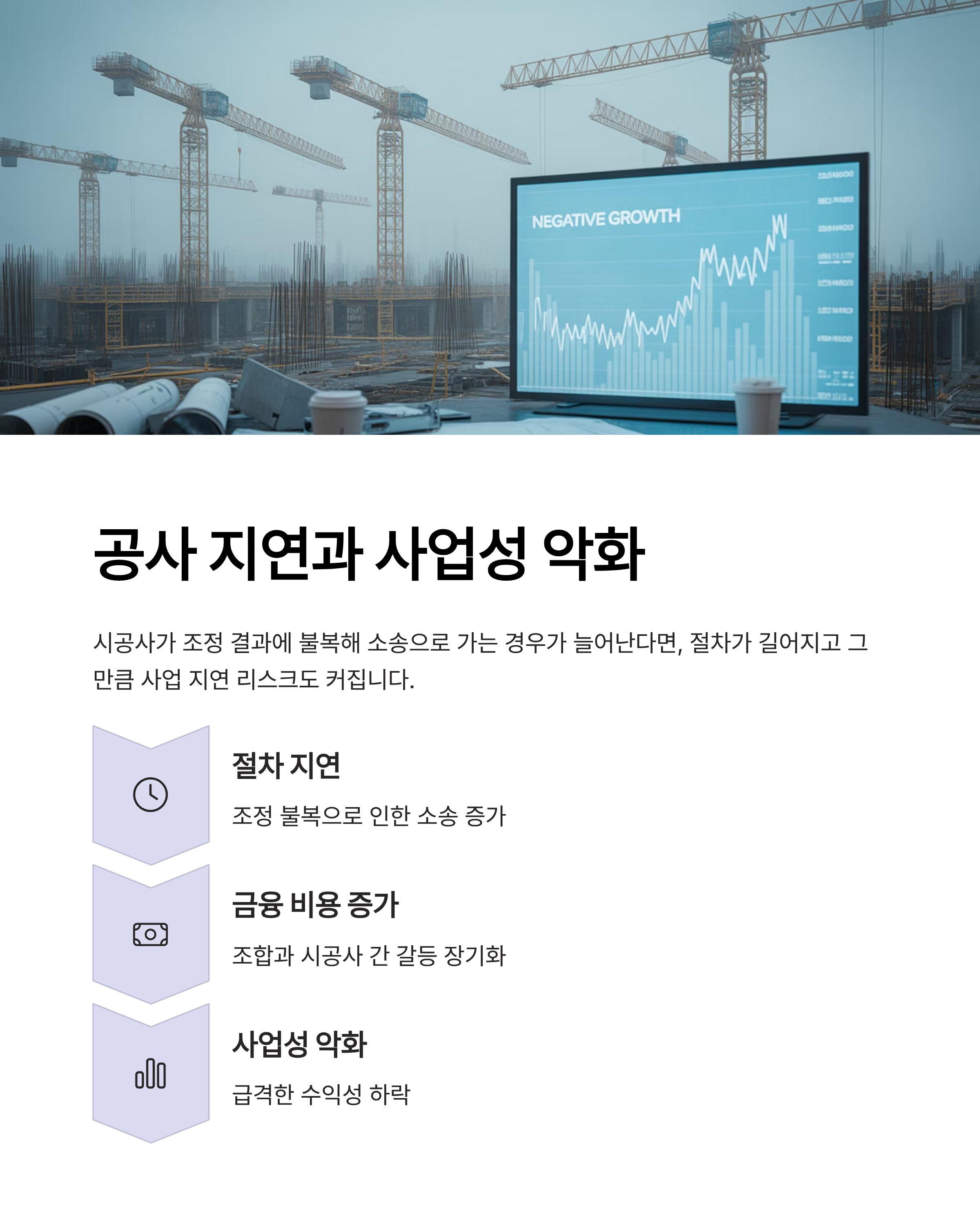 시공사가 조정 결과에 불복해 소송으로 가는 경우가 늘어난다면, 절차가 길어지고 그만큼 사업 지연 리스크도 커집니다. 특히 조합과 시공사 간 갈등이 길어질수록 금융 비용은 늘어나고, 사업성도 급격히 떨어질 수 있습니다.