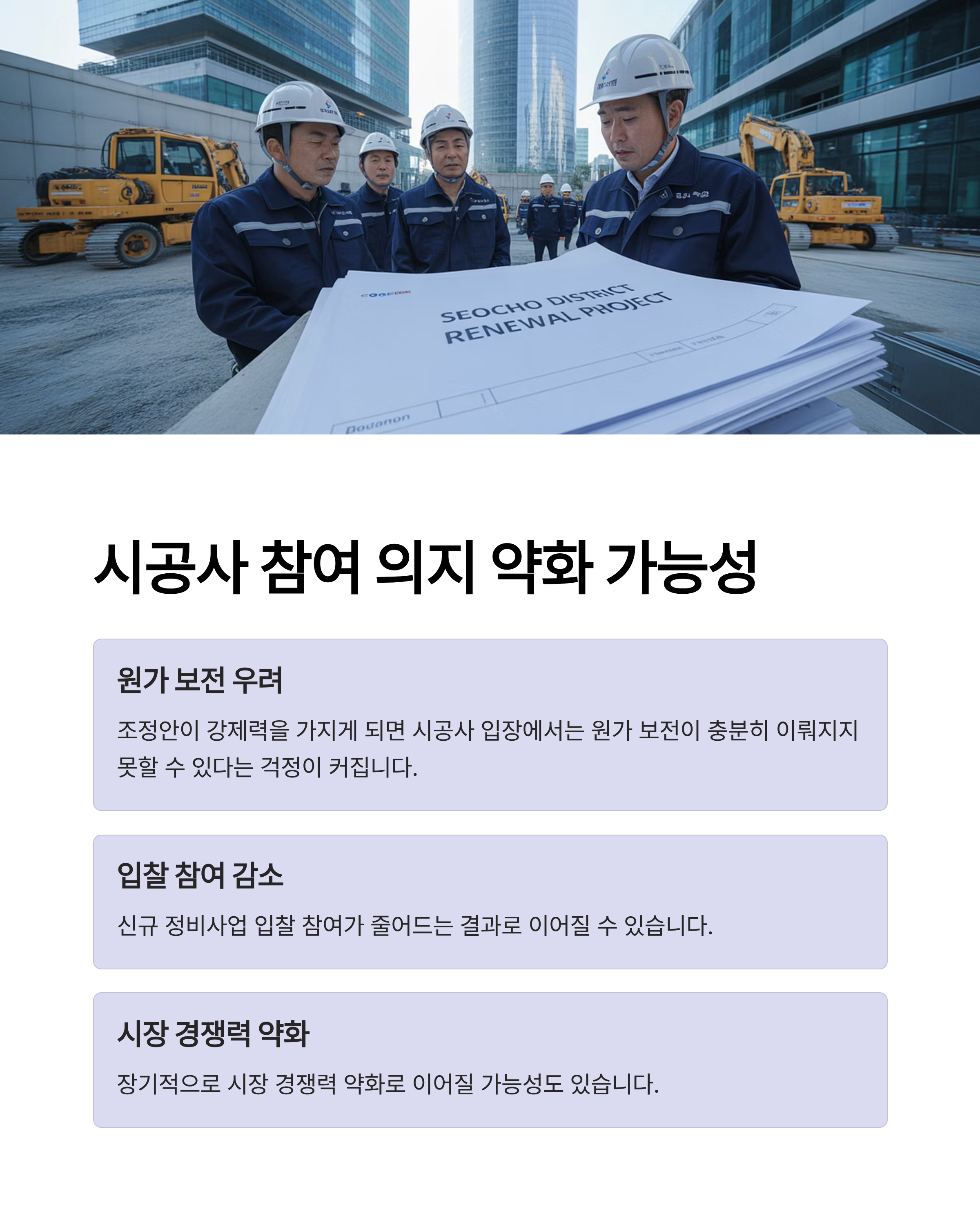 조정안이 강제력을 가지게 되면 시공사 입장에서는 원가 보전이 충분히 이뤄지지 못할 수 있다는 걱정이 커집니다. 결국 신규 정비사업 입찰 참여가 줄어드는 결과로 이어질 수 있죠. 이는 장기적으로 시장 경쟁력 약화로 이어질 가능성도 있습니다.
