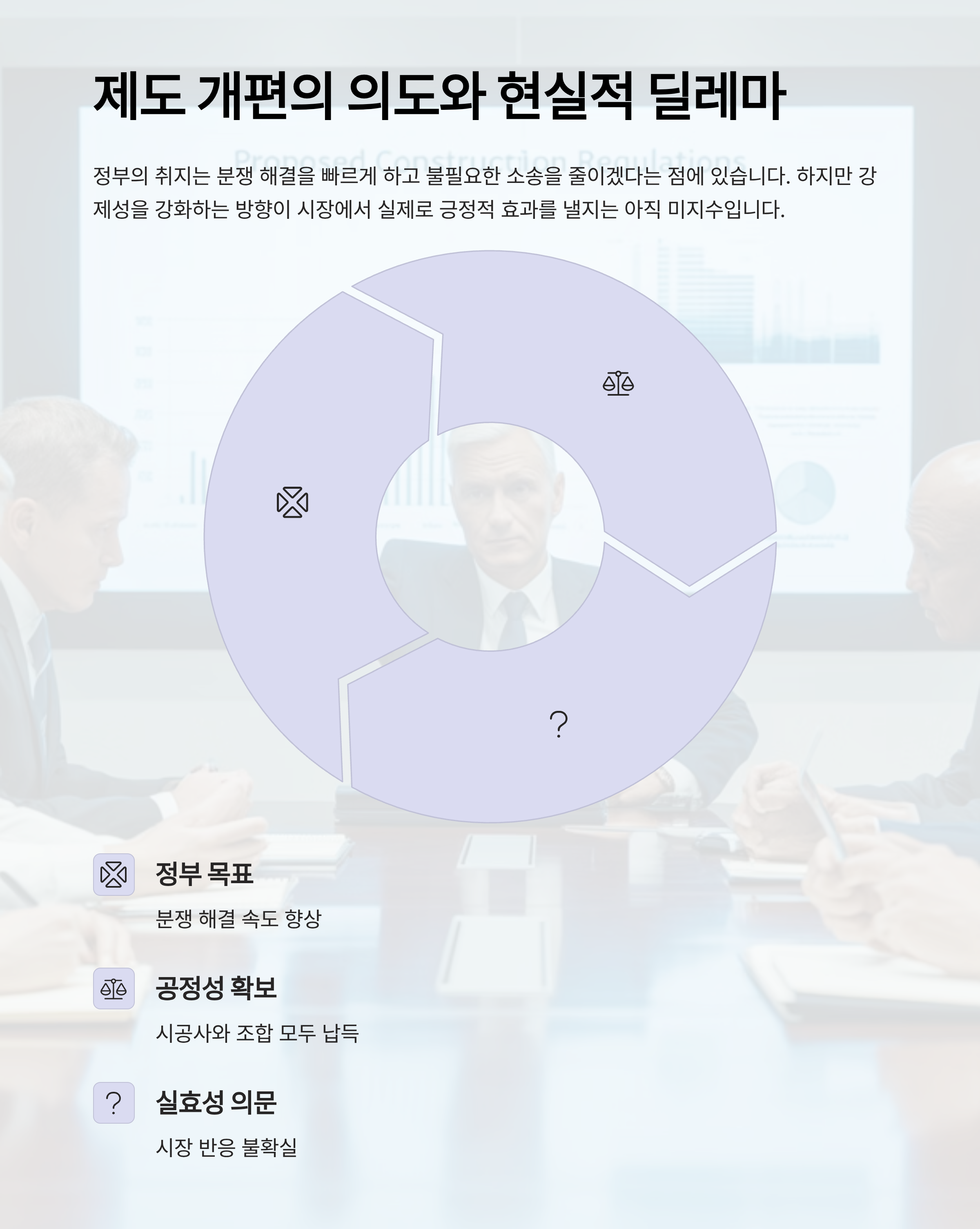 정부의 취지는 분쟁 해결을 빠르게 하고 불필요한 소송을 줄이겠다는 점에 있습니다. 하지만 강제성을 강화하는 방향이 시장에서 실제로 긍정적 효과를 낼지는 아직 미지수입니다. 조정 결정이 신뢰를 얻기 위해서는 시공사와 조합 모두 납득할 수 있는 공정성이 전제되어야 합니다.