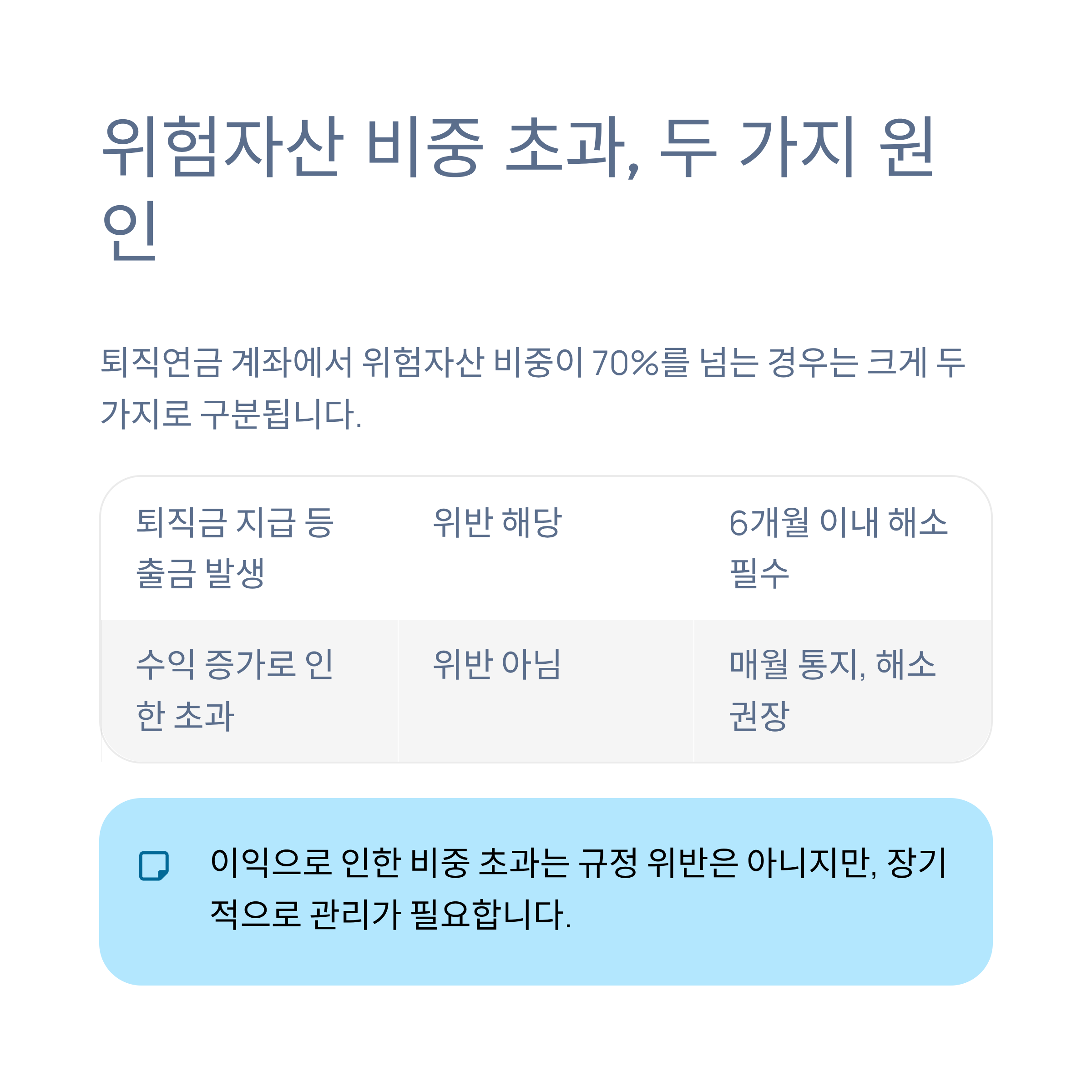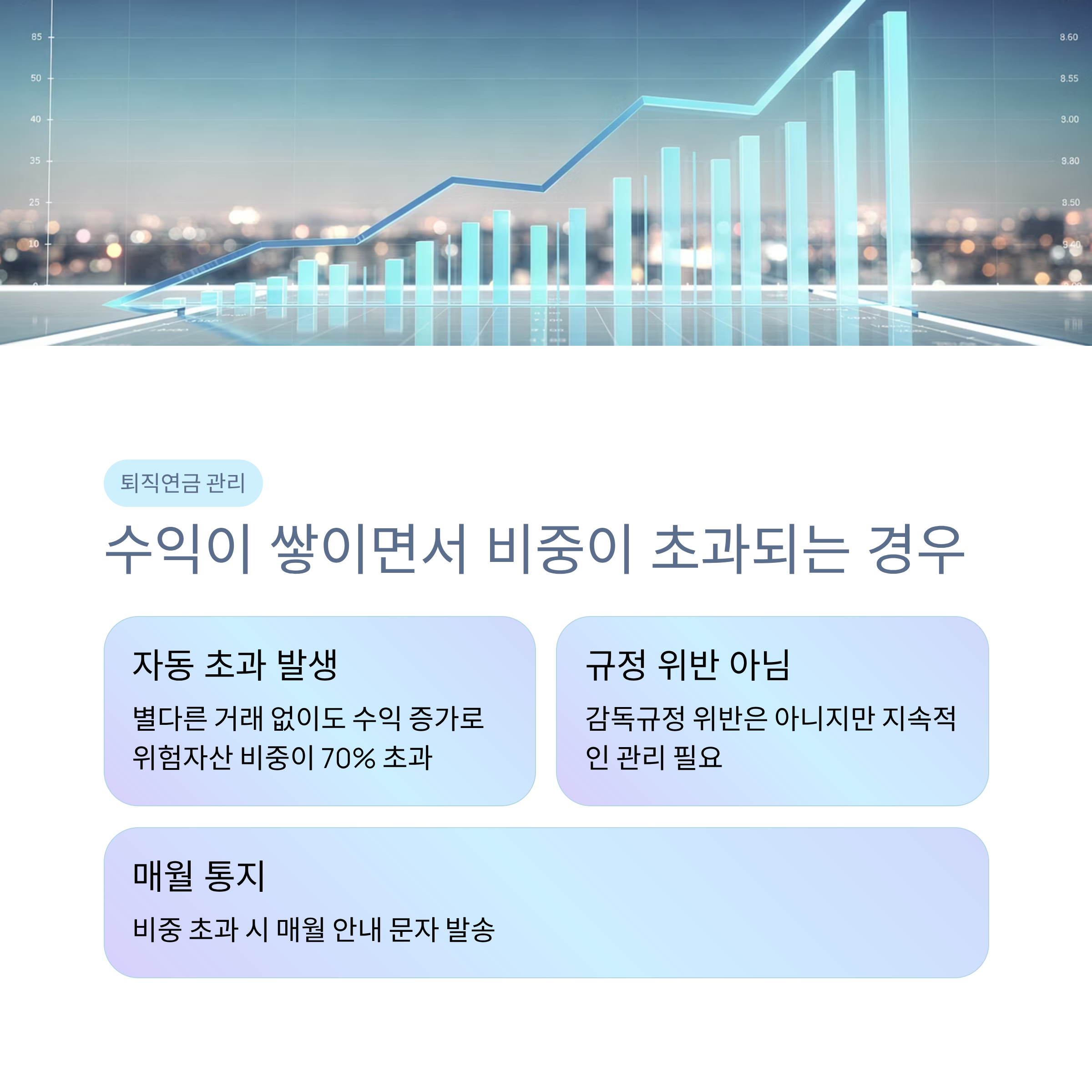 퇴직연금 계좌를 운용하다 보면 어느 날 갑자기 ‘위험자산 비중이 70%를 초과했다’는 알림을 받는 경우가 있습니다. 특히 별다른 거래 없이도 수익이 쌓이면서 비중이 넘어가는 경우가 있는데요, 이런 상황은 감독규정 위반은 아니지만 지속적으로 관리가 필요합니다. 이번 글에서는 ‘이익으로 인한 위험자산 비중 초과’ 상황의 안내 내용과 적절한 해결 방안을 정리해 드릴게요.