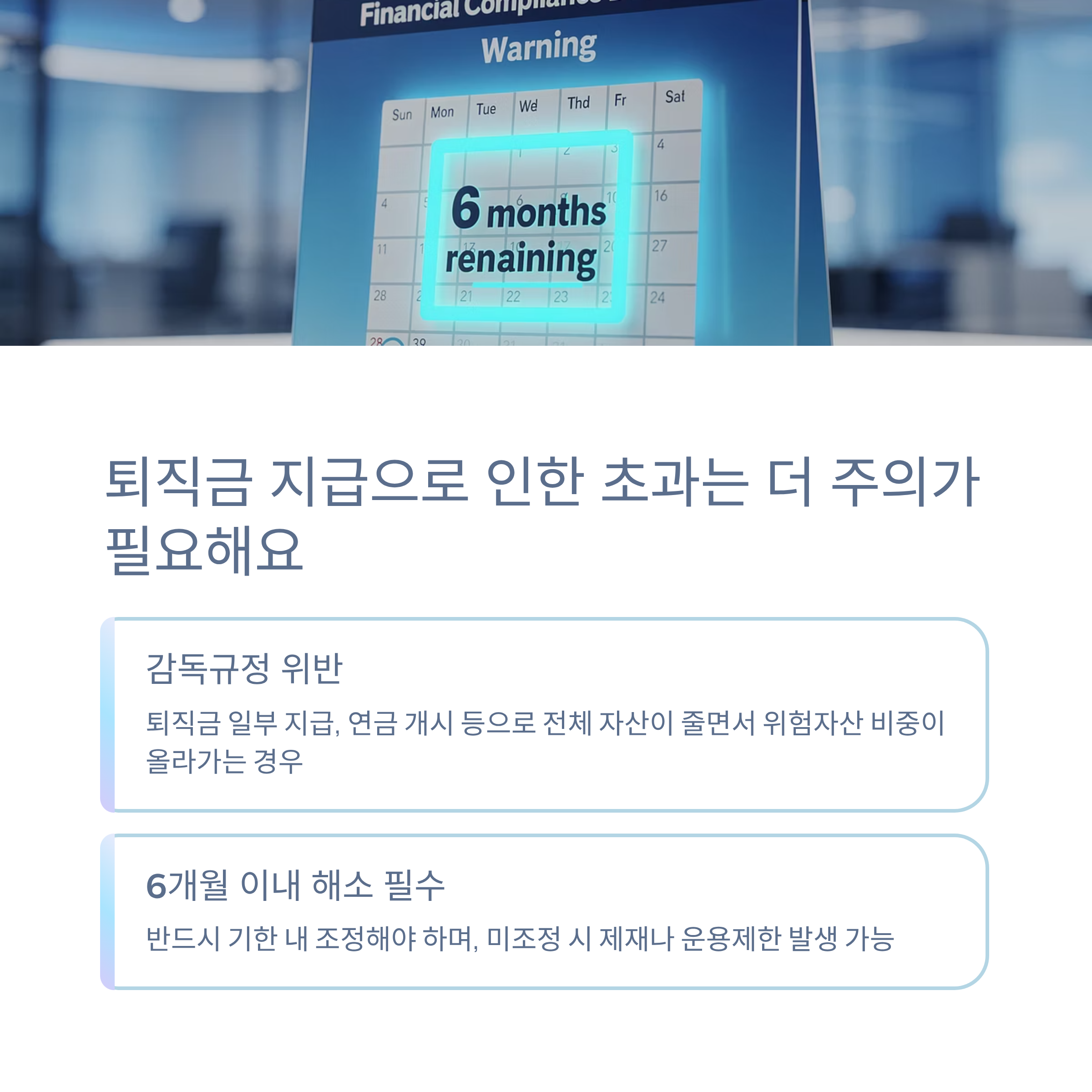 | 퇴직금 지급, 출금 발생 등 | 감독규정 위반, 반드시 조치 | 6개월 이내 해소 |