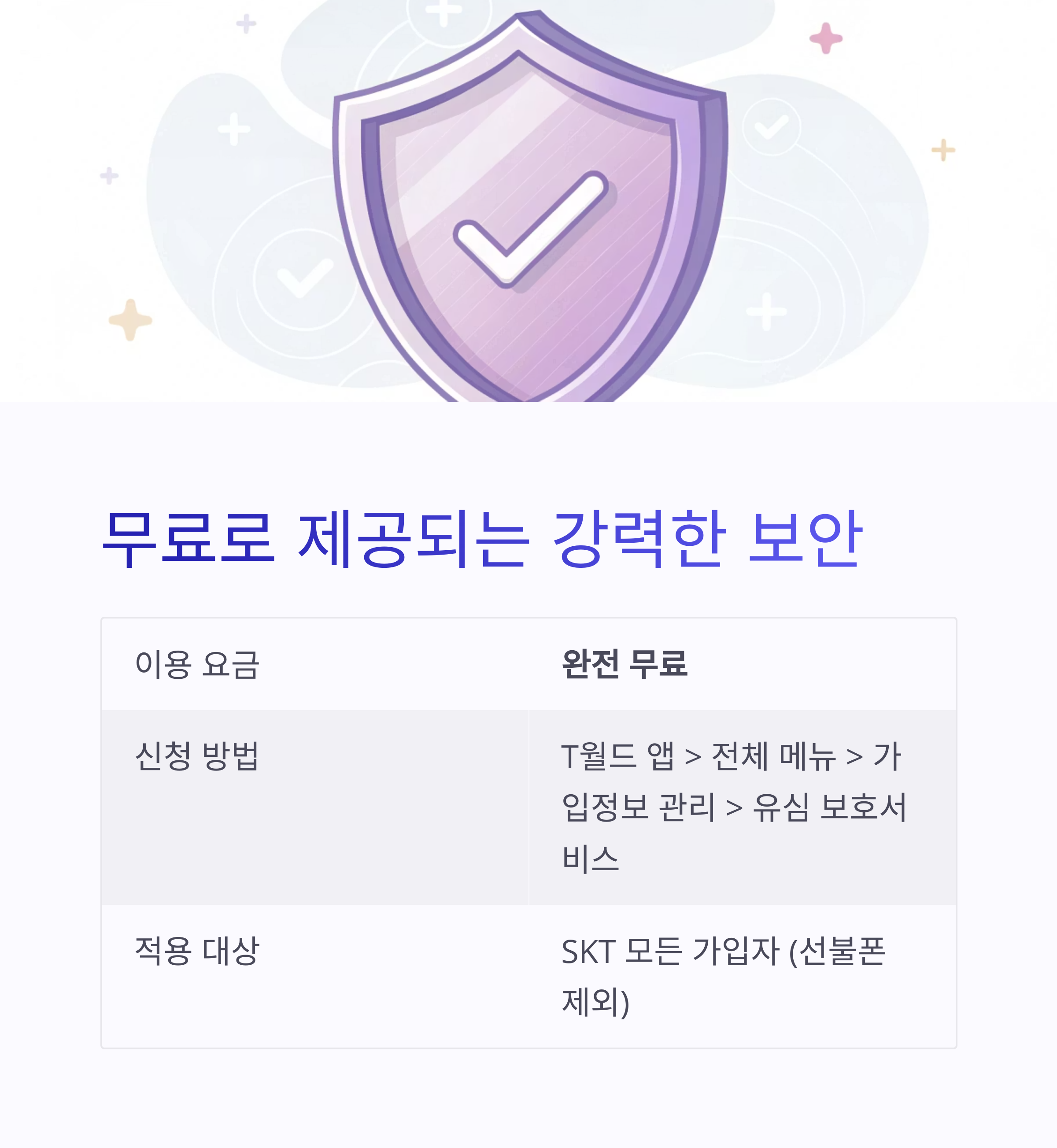 | 신청 방법 | T월드 앱 > 전체 메뉴 > 가입정보 관리 > 유심 보호서비스 |