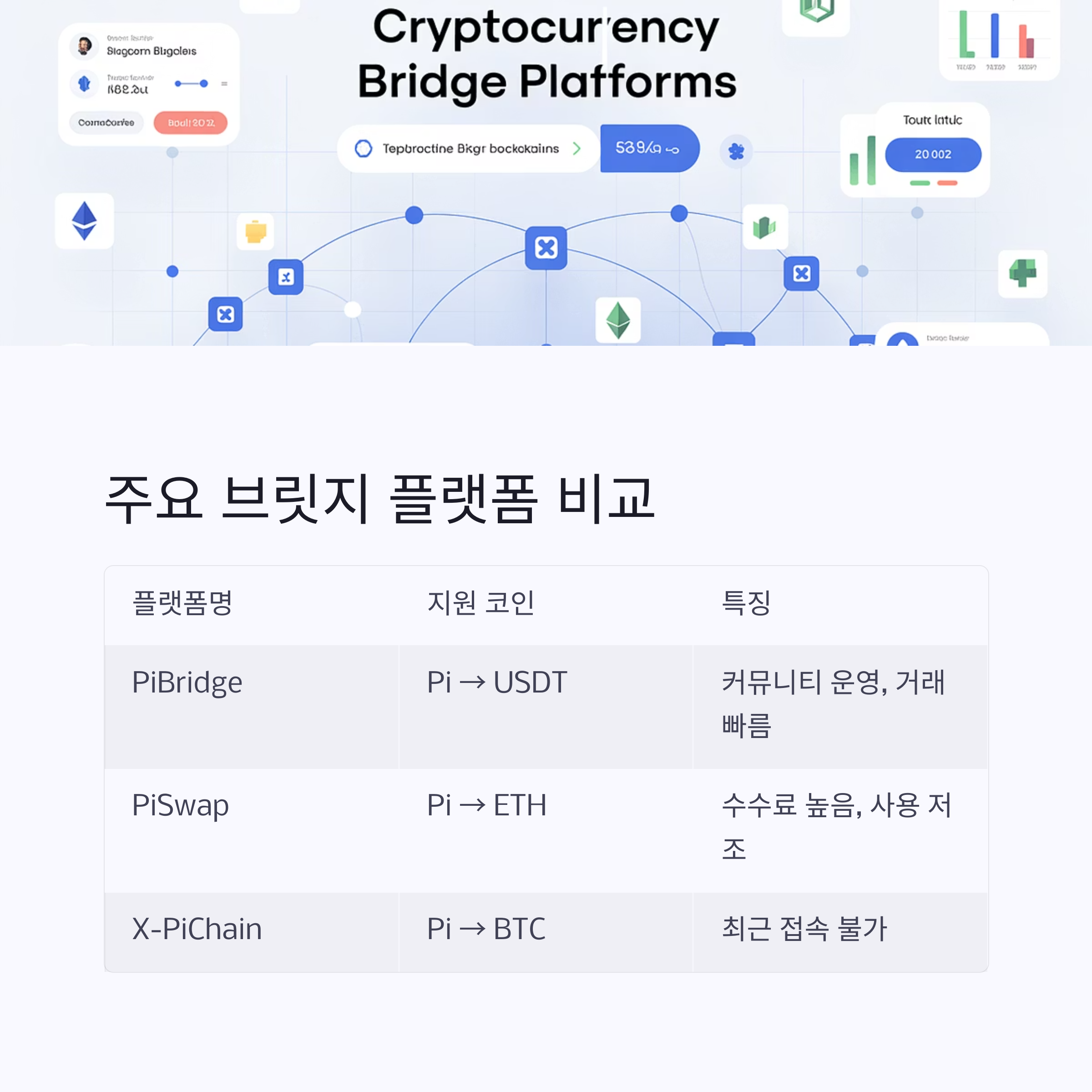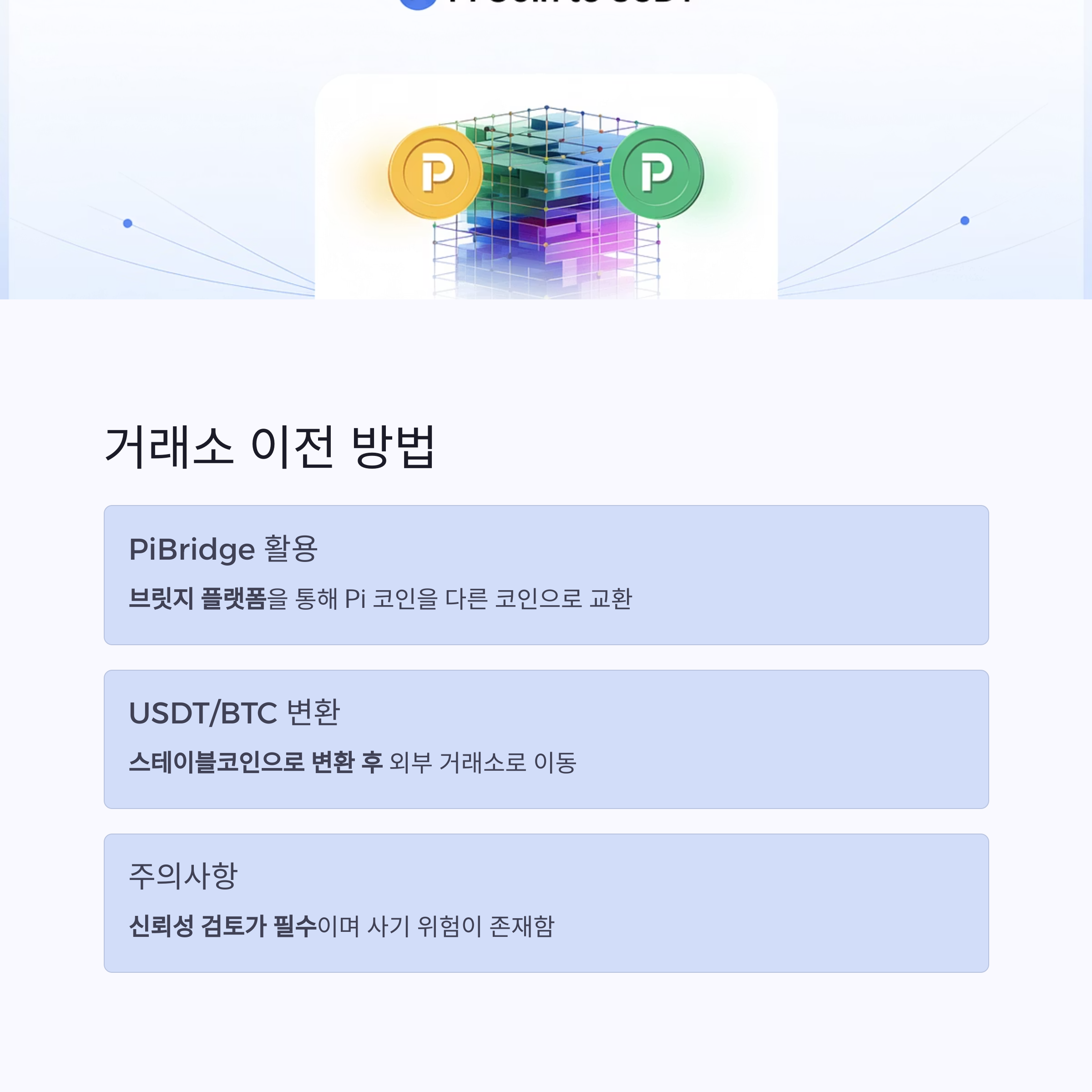 | Pi → PiBridge | 브릿지를 통한 타 코인 변환 | 수수료, 사기 주의 |