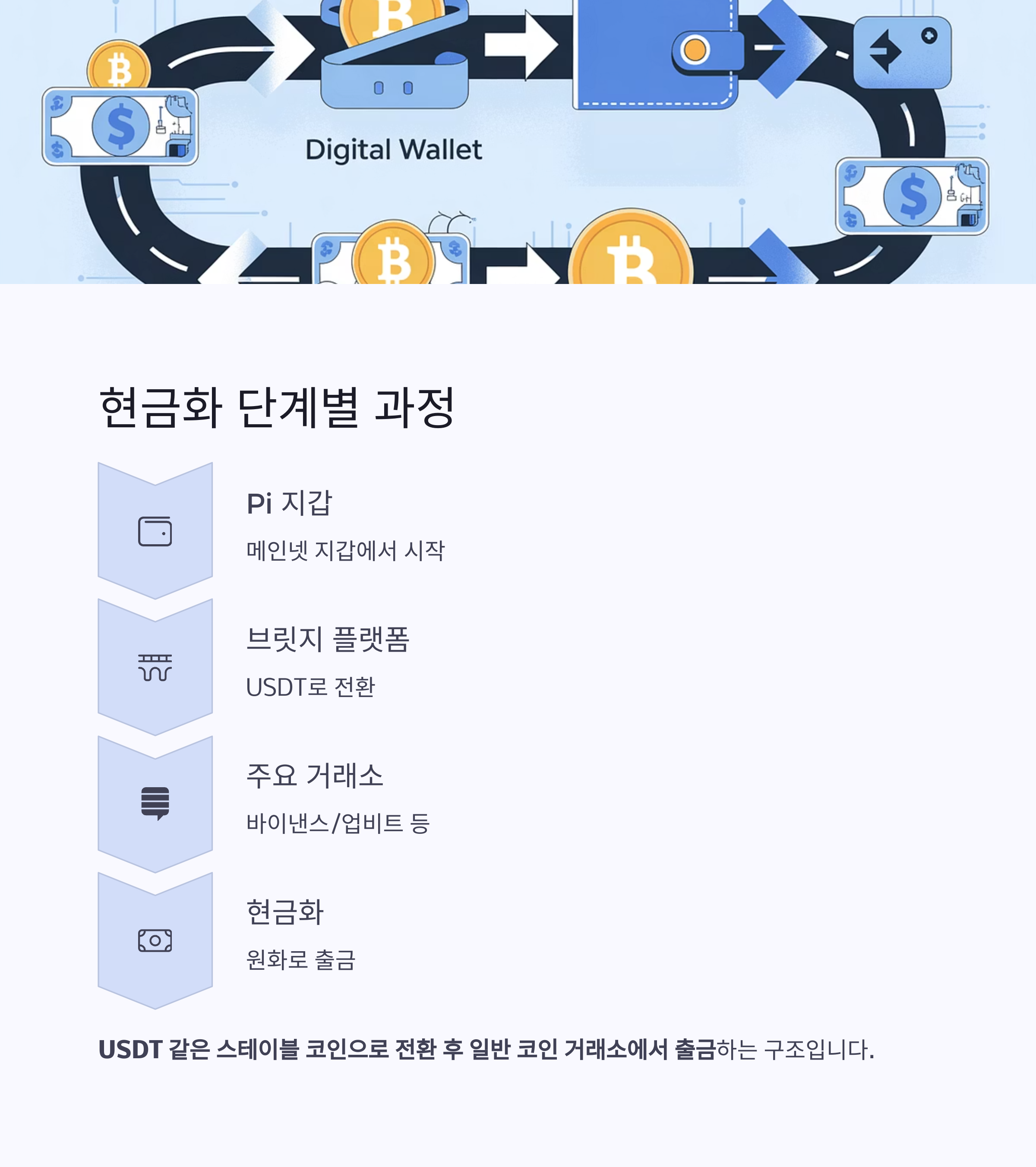 "Pi → 브릿지 플랫폼 → USDT → 바이낸스 등 주요 거래소 → 출금 → 현금화"의 순서를 따릅니다.