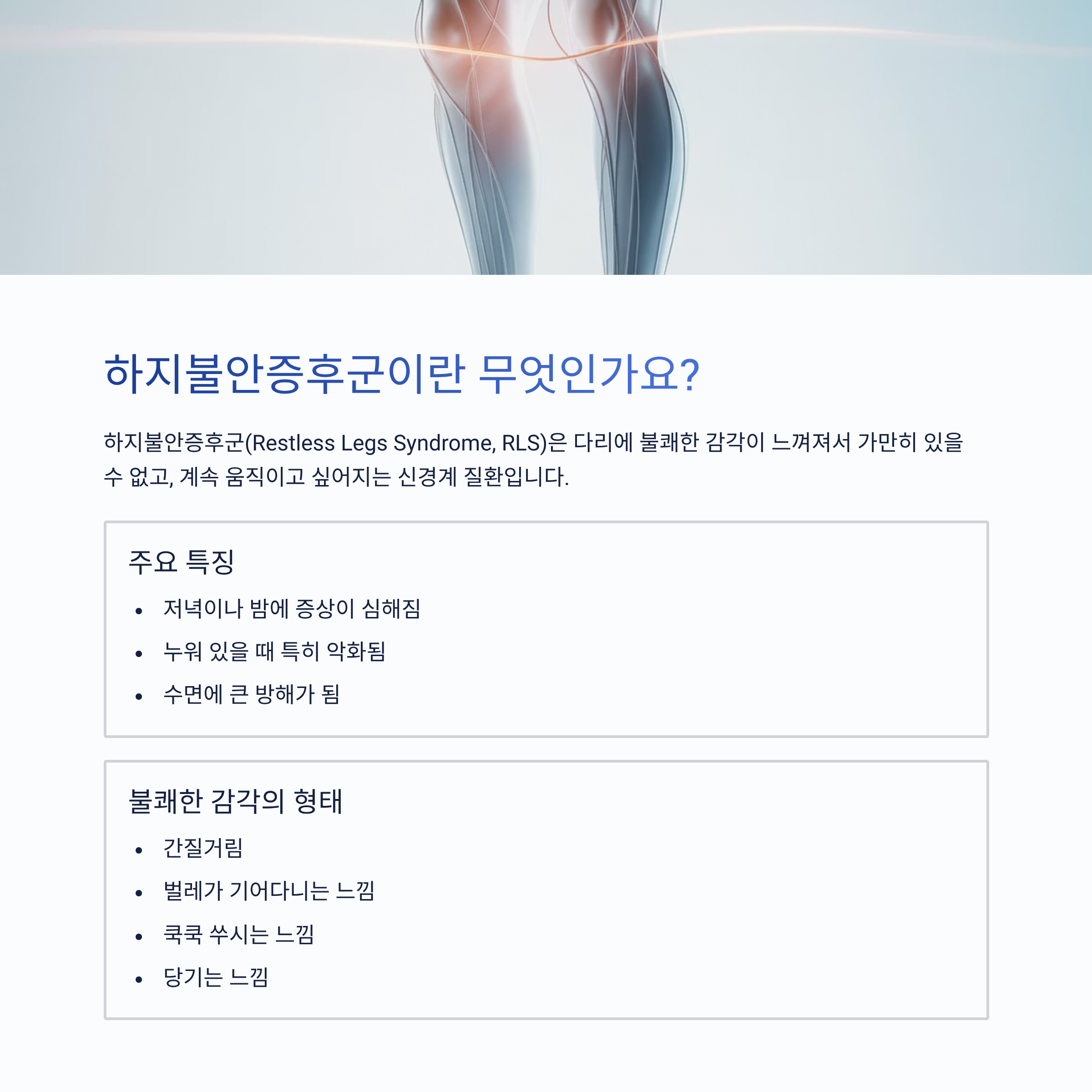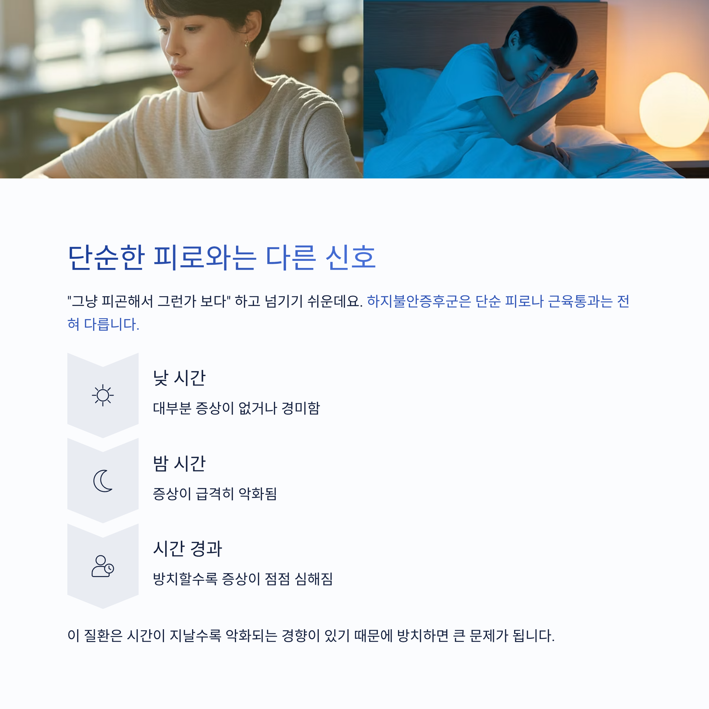 "그냥 피곤해서 그런가 보다" 하고 넘기기 쉬운데요. 하지불안증후군은 단순 피로나 근육통과는 전혀 다릅니다.