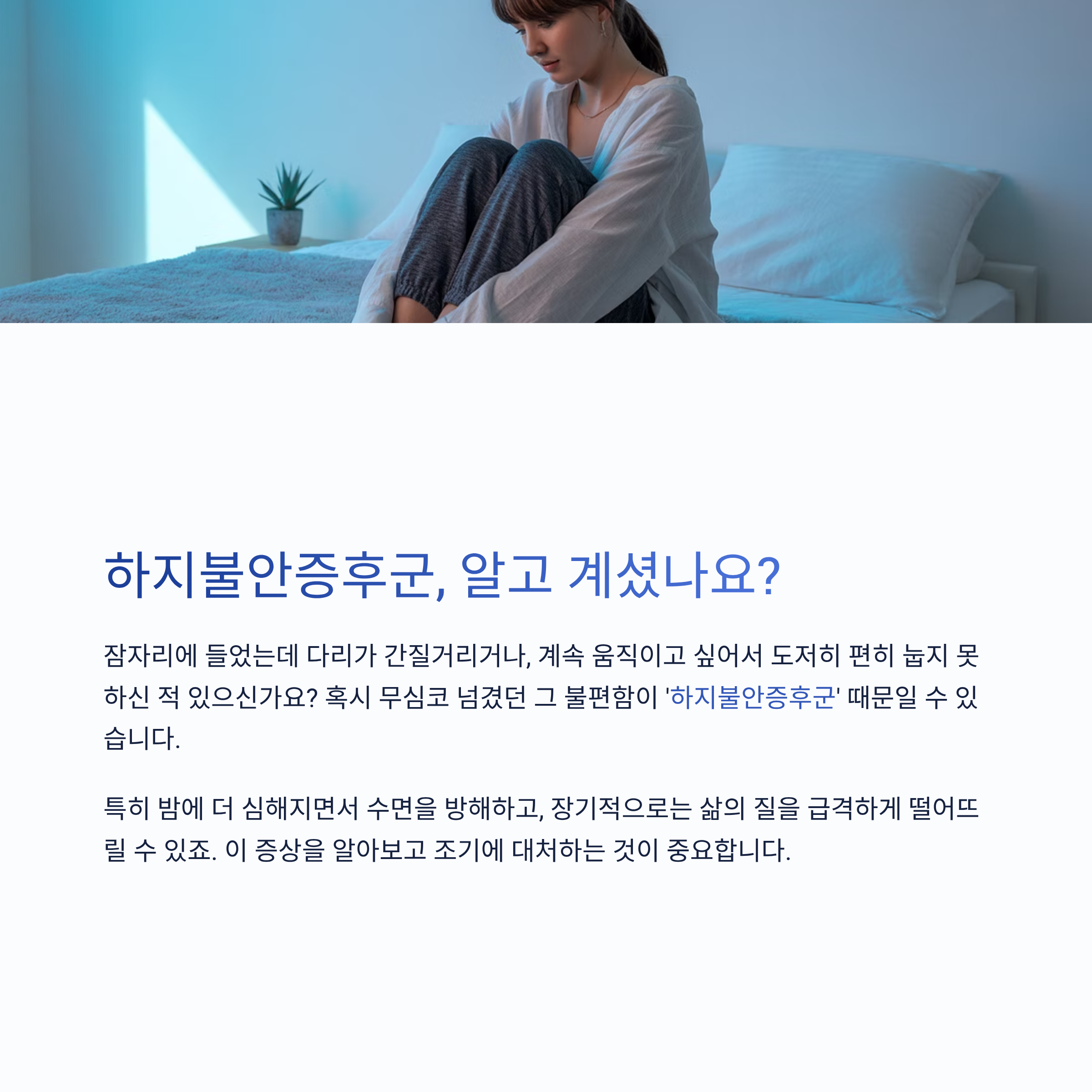 잠자리에 들었는데 다리가 간질거리거나, 계속 움직이고 싶어서 도저히 편히 눕지 못하신 적 있으신가요? 혹시 무심코 넘겼던 그 불편함이 '하지불안증후군' 때문일 수 있습니다. 특히 밤에 더 심해지면서 수면을 방해하고, 장기적으로는 삶의 질을 급격하게 떨어뜨릴 수 있죠. 이번 글에서는 하지불안증후군의 주요 증상부터 치료가 필요한 이유, 방치했을 때 생길 수 있는 위험까지 정리해드립니다.