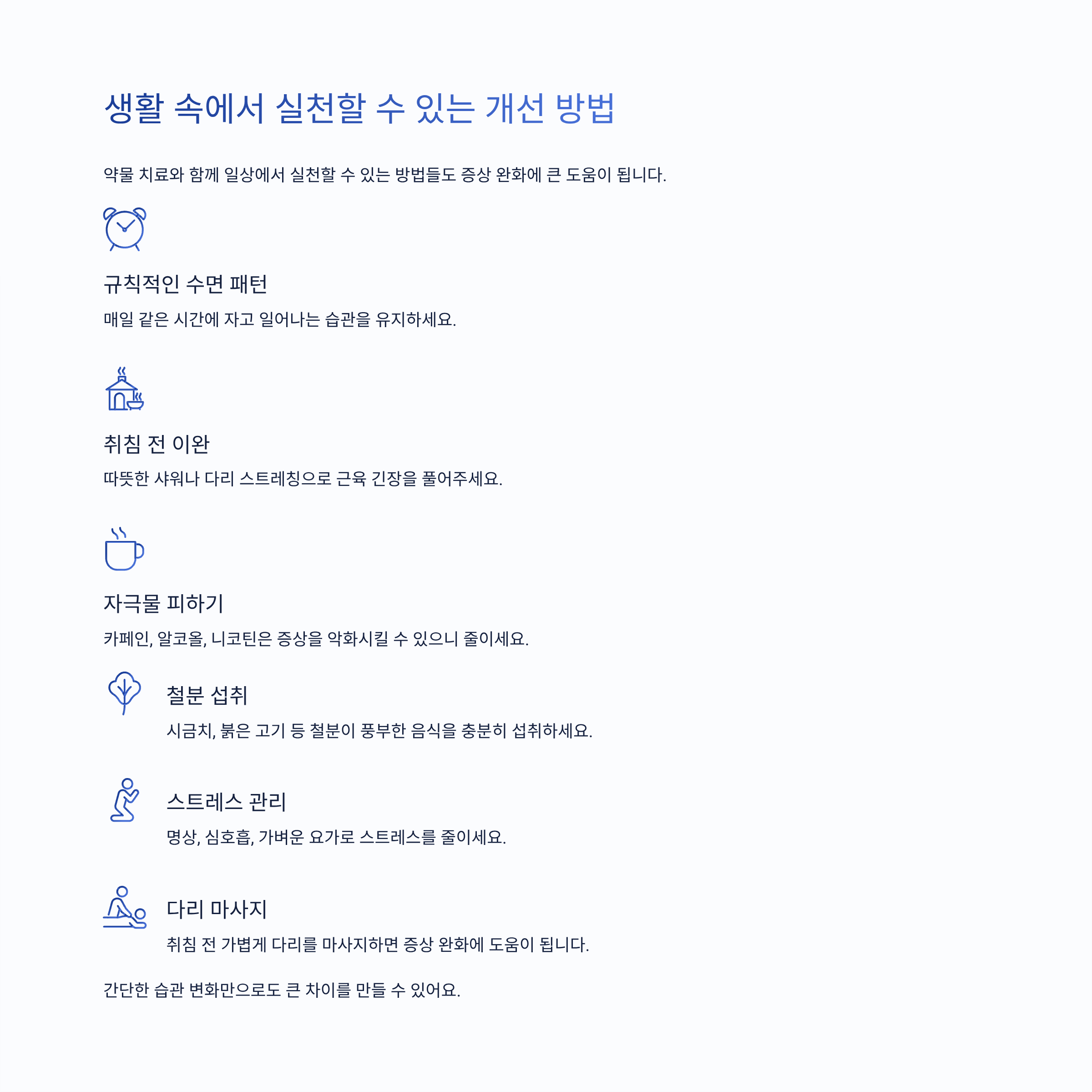 - 자기 전 스트레칭이나 따뜻한 샤워로 긴장 완화