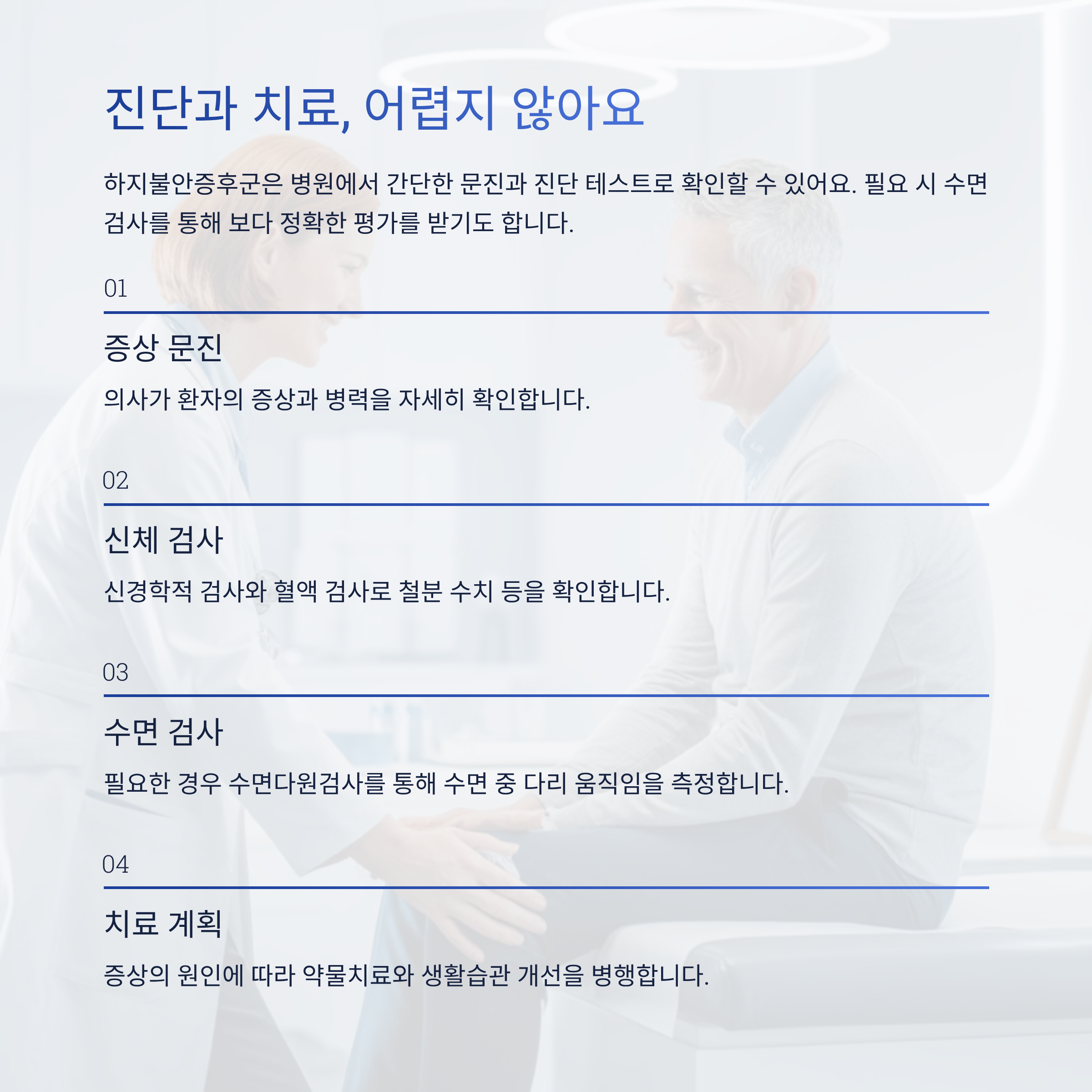 하지불안증후군은 병원에서 간단한 문진과 진단 테스트로 확인할 수 있어요.