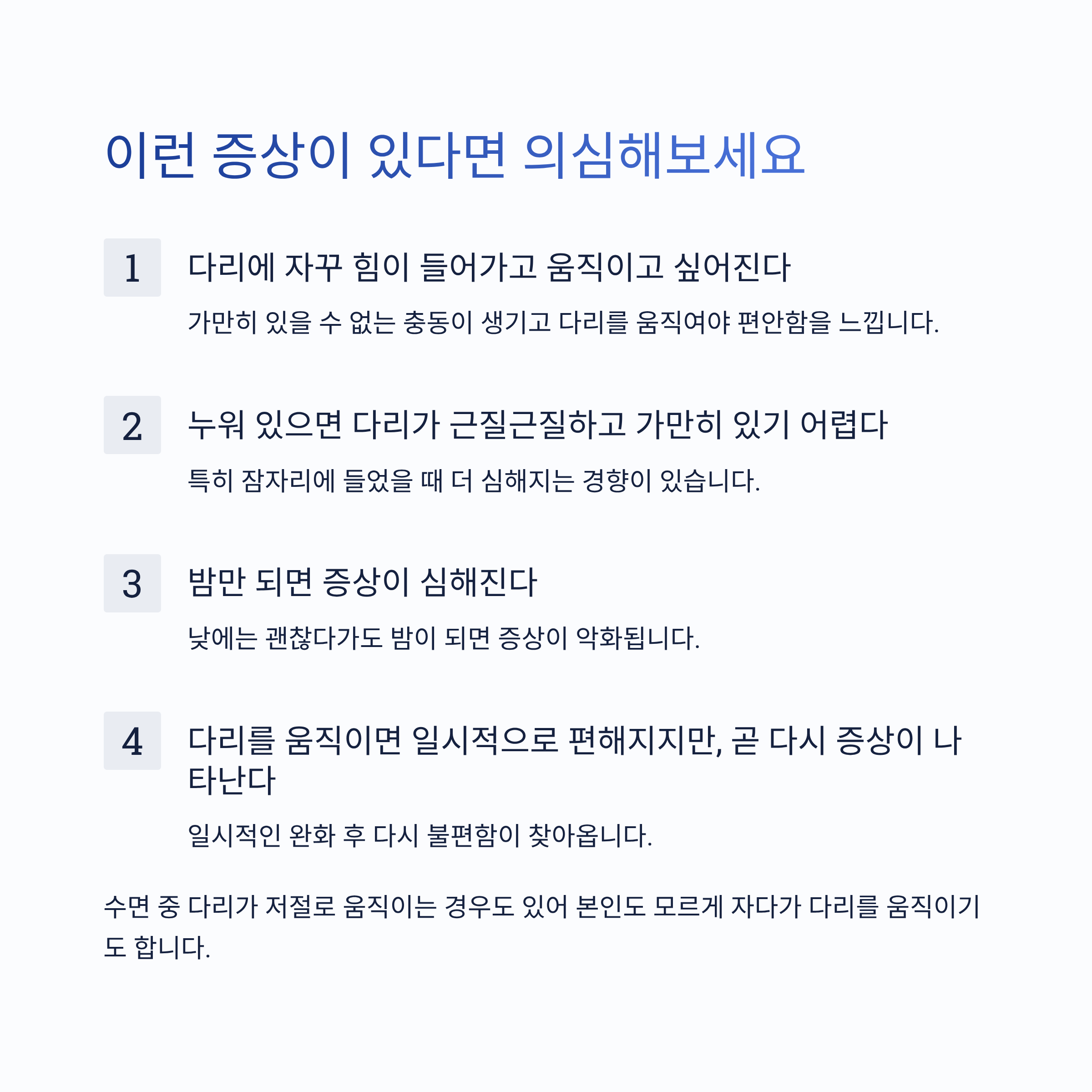 - 누워 있으면 다리가 근질근질하고 가만히 있기 어렵다
