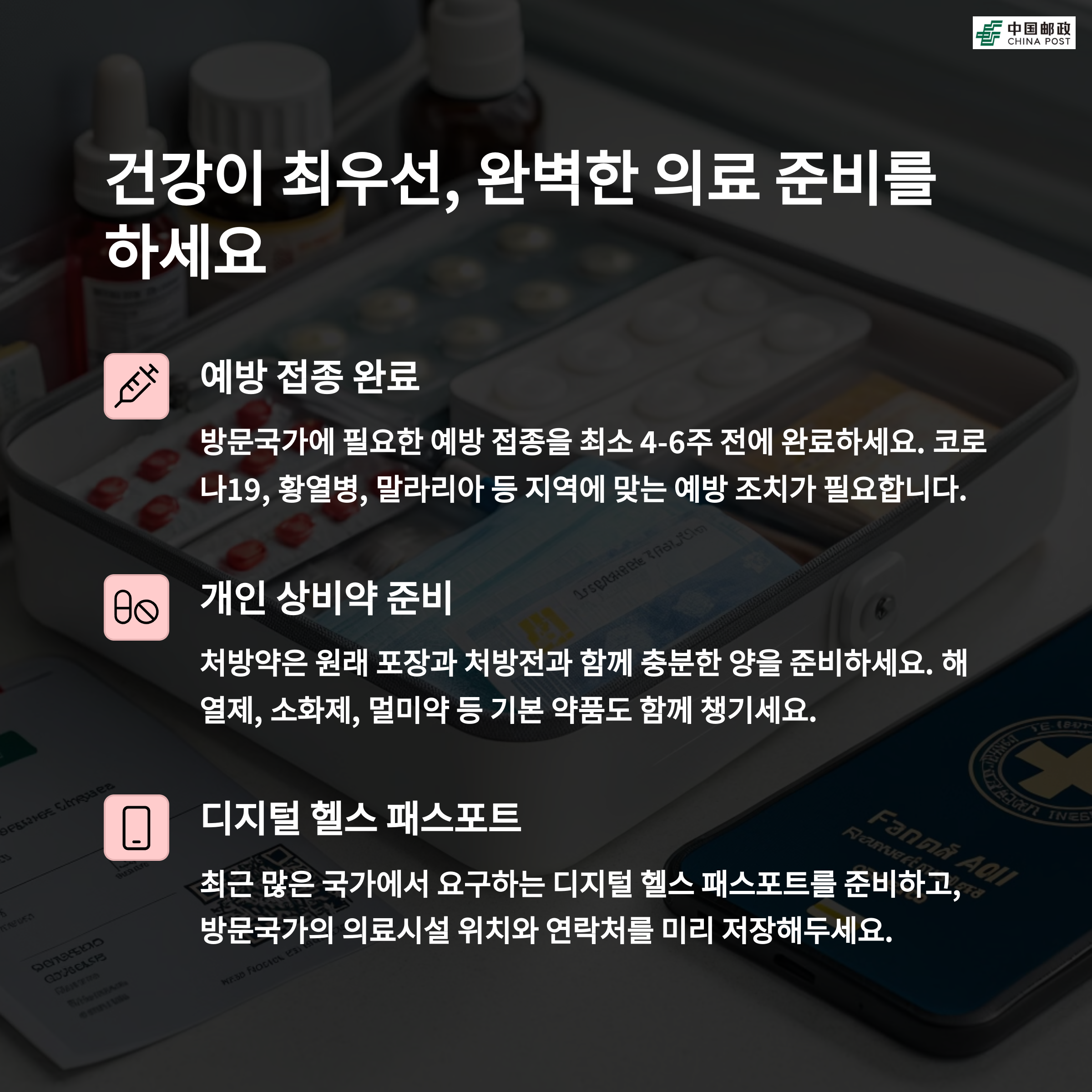 건강 관리 및 예방 접종은 해외 여행에서 매우 중요한 준비 사항입니다. 특정 지역에 따라 예방 접종을 미리 맞아야 할 수 있으며, 이를 위해 최소 8주 전에 접종을 완료해야 합니다. 또한, 디지털 헬스 패스포트는 코로나19 백신 접종 기록과 건강 상태를 관리할 수 있는 필수 아이템입니다. 여행 기간 동안 복용하는 약이 있다면 충분히 준비하고, 현지에서의 약품 구매 가능 여부를 미리 파악하는 것도 중요합니다.