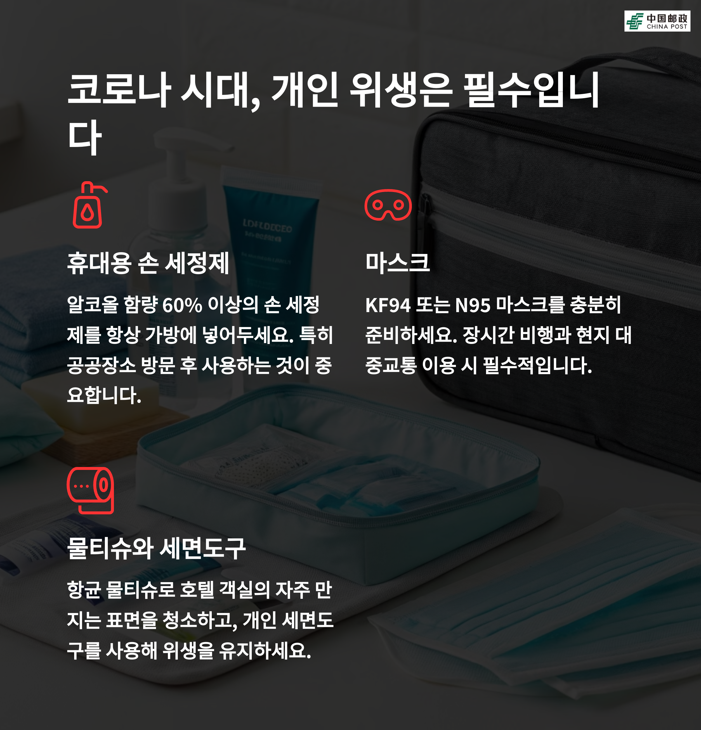 | 여권, 비자, 항공권 등 | 예방 접종, 약품 준비 | 손 세정제, 마스크 |