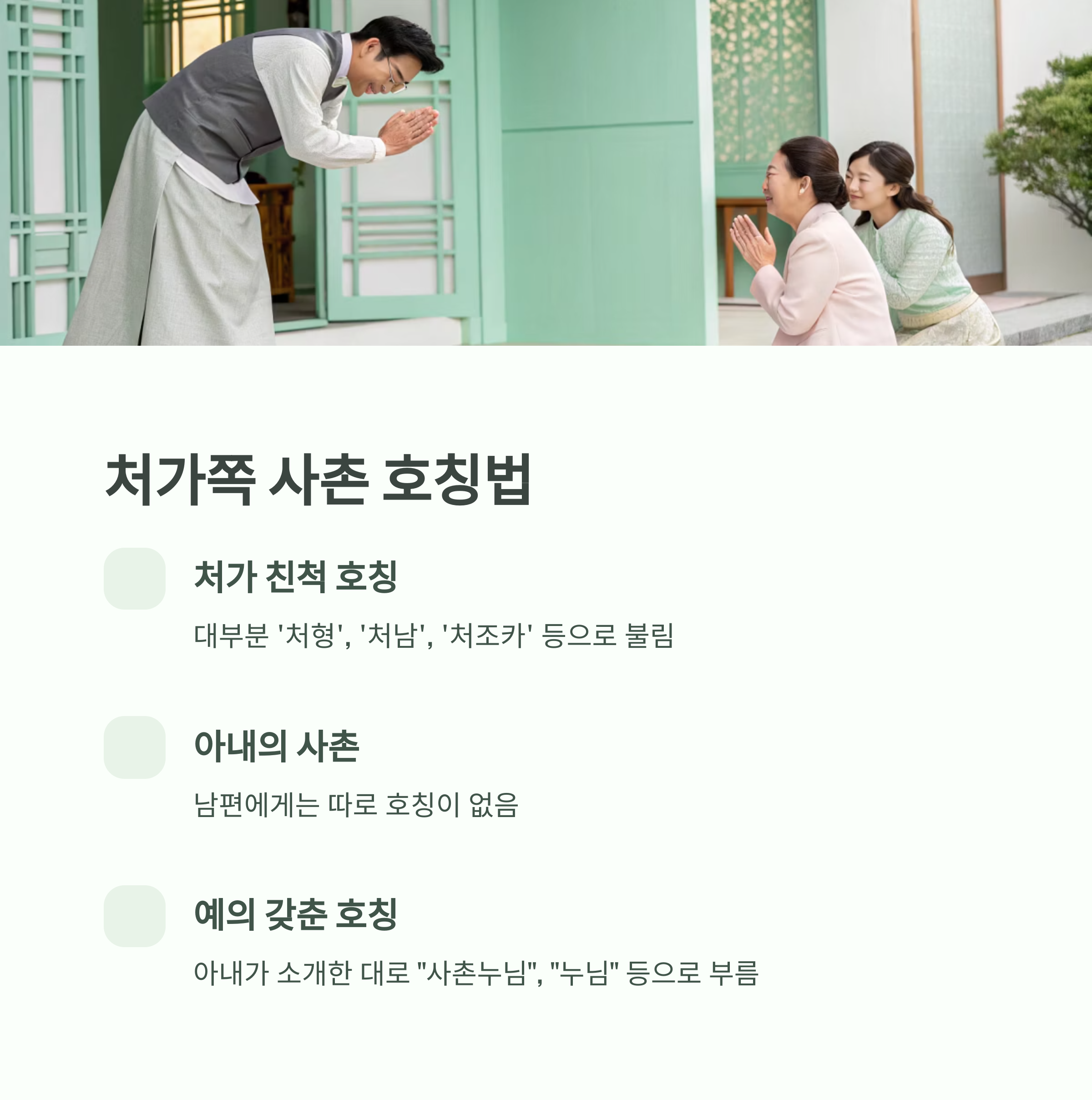 처가, 즉 아내 쪽 친척은 대부분 ‘처형’, ‘처남’, ‘처조카’ 등으로 불리며