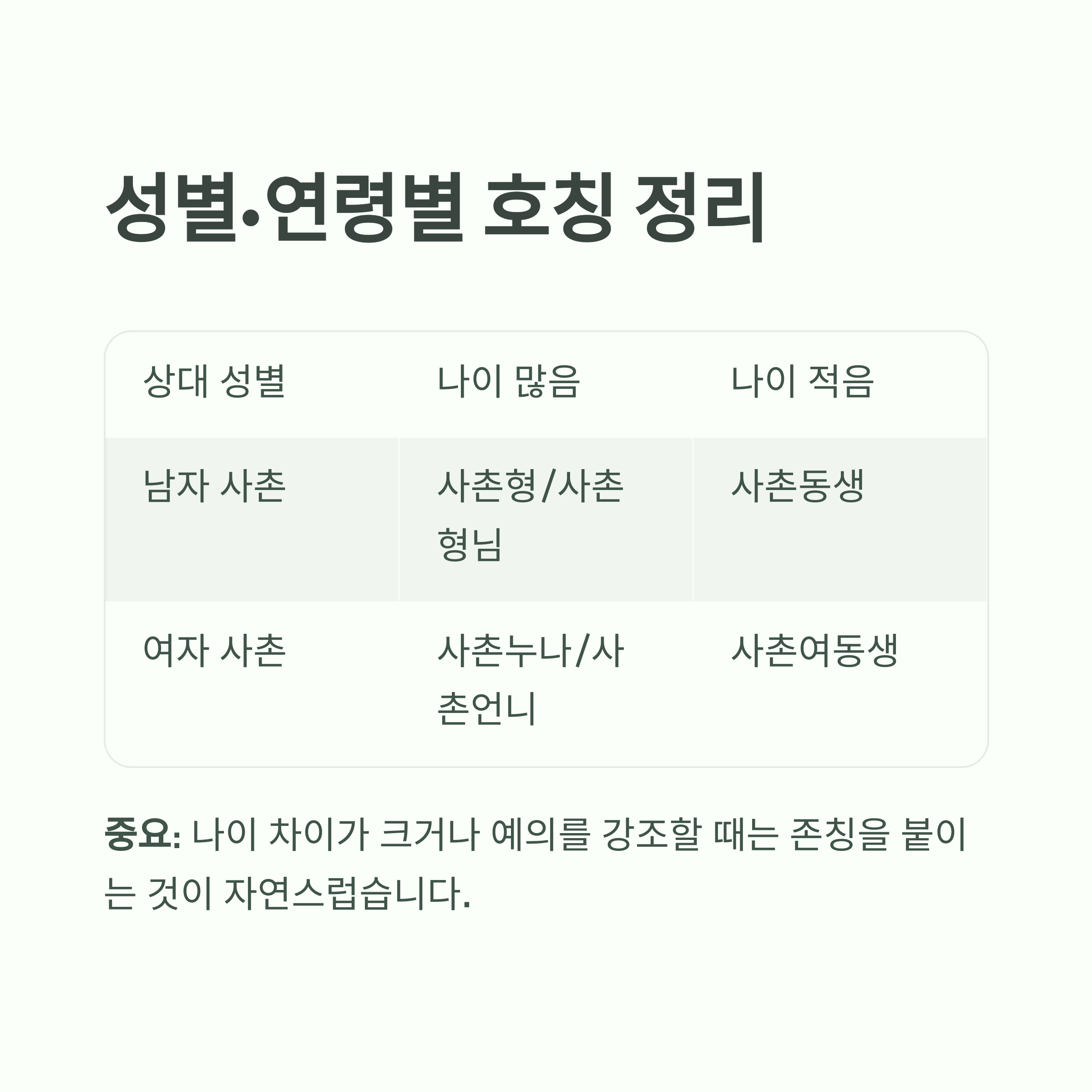 중요: 사촌이라도 나이 차이가 크거나 예의를 강조할 때는 ‘사촌형님’, ‘사촌누님’처럼
