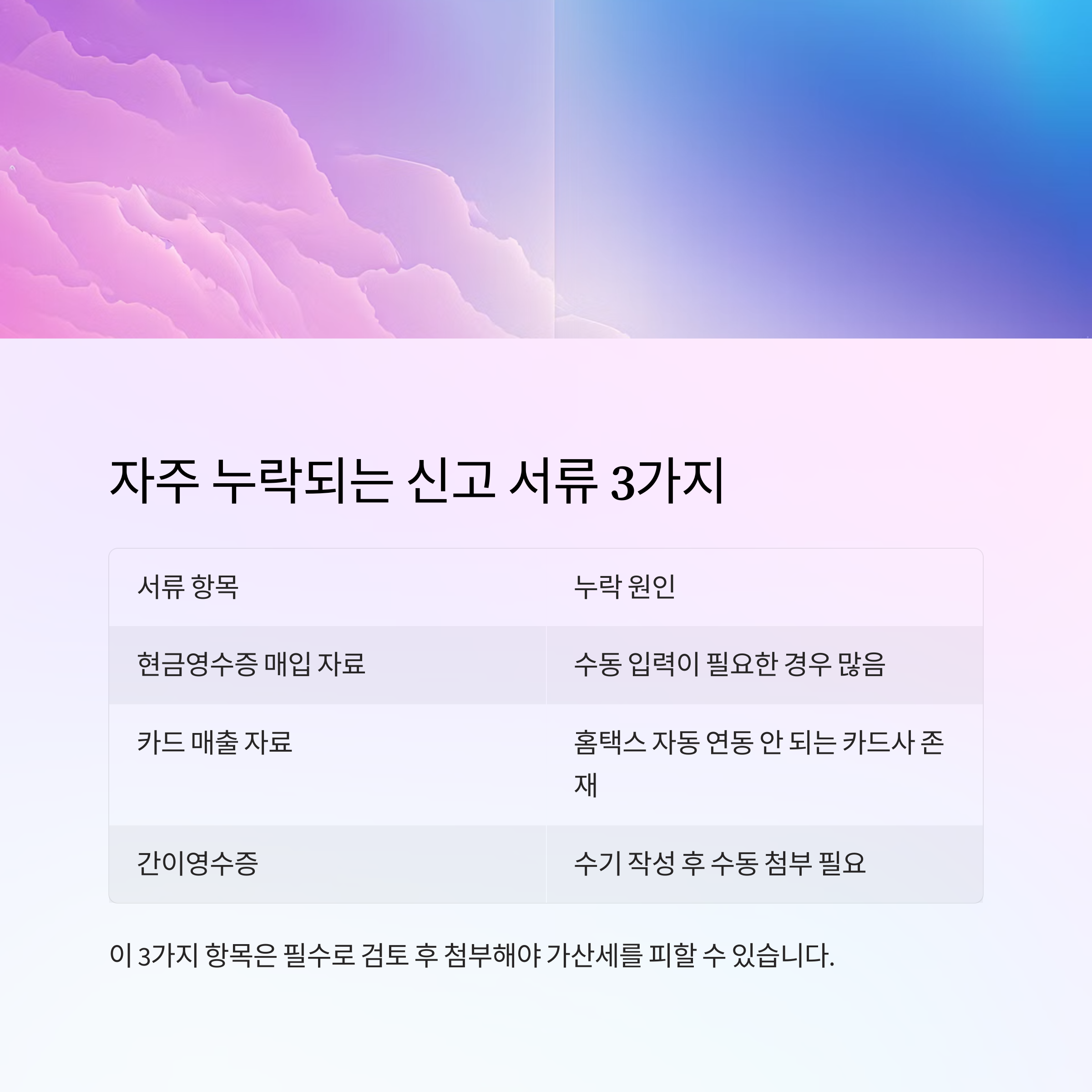 특히 홈택스가 자동으로 불러오지 않는 지출 증빙이나 수기로 작성해야 하는 기타 소득 내역이 대표적입니다.