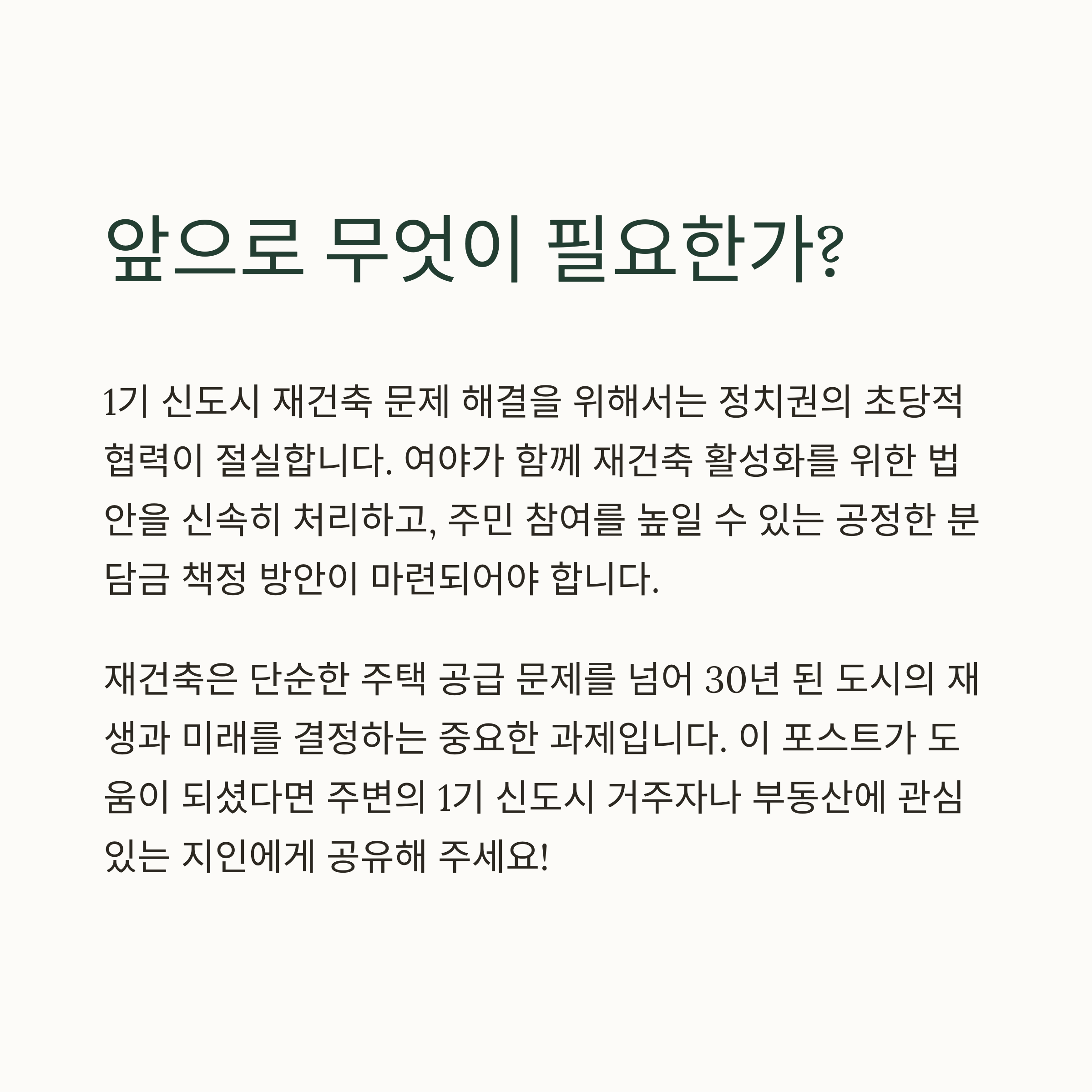 1기 신도시 재건축은 정치적, 경제적, 사회적 요인들이 복합적으로 작용하며 진전 속도가 늦어지고 있습니다. 더 나은 정책적 합의와 주민 간 협력이 필수 조건으로 대두되고 있는 상황입니다. 이 문제를 해결하기 위해 정책 당국은 경제적 보조와 법적 기준을 적절히 완화할 방안을 모색할 필요가 있습니다.